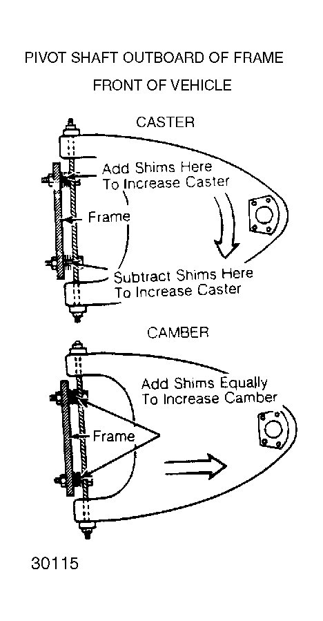 To decrease positive caster, transfer one or more shims from between rear upper control arm bolt and frame to front bolt and vise versa. See Figure . If a normal shim pack will not bring vehicle within specifications, check for damaged control arms and related parts.
