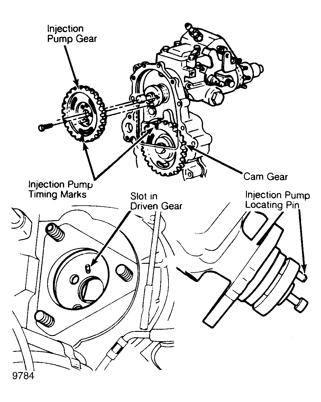 1. Install new injection pump gasket. Align locating pin on injection pump hub with slot in injection pump driven gear while aligning injection pump timing marks. See Figure.