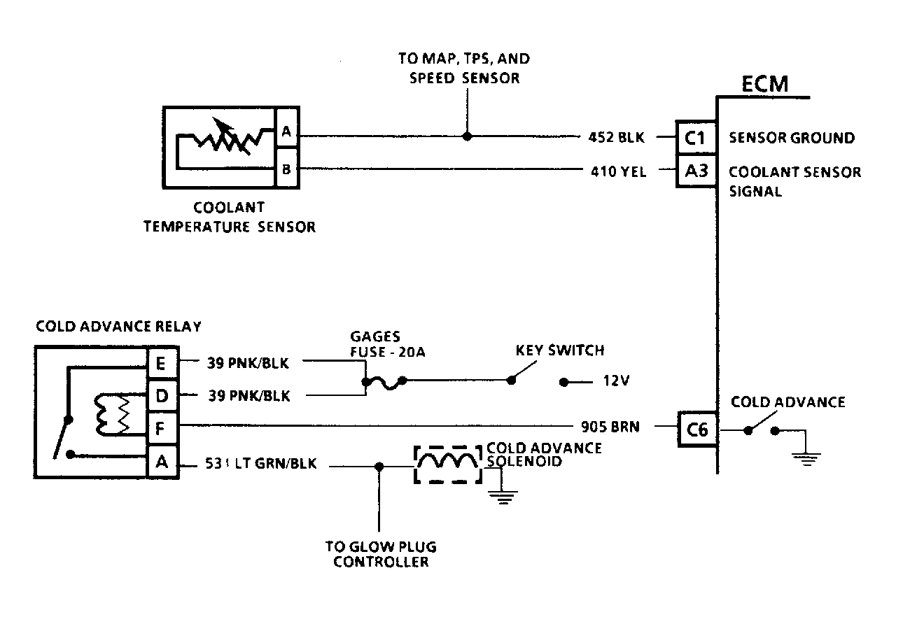 - Disconnect harness connector to cold advance relay. Using an ohmmeter, check resistance between relay terminals "D" and "F". See Fig 1. Continuity should be present or a resistance of 20 ohms. If not, replace cold advance relay.