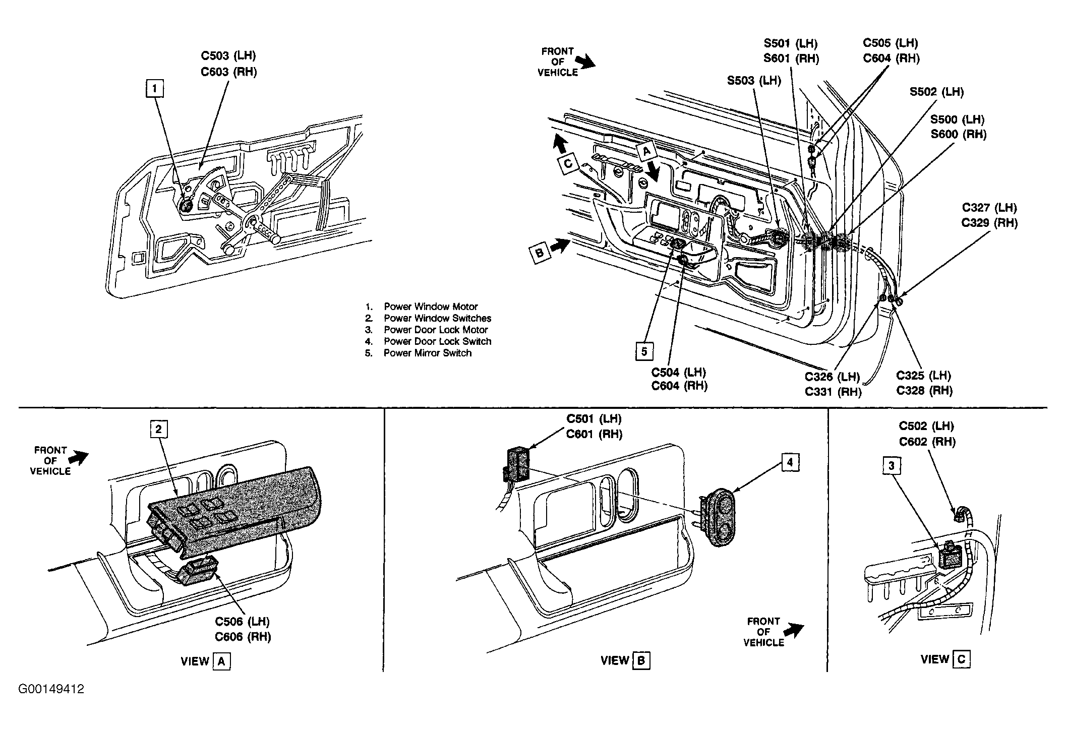 | S501 | In Power Window & Locks Harness, Left Front Door, Near Power Window Motor Lead. See Fig 3 . |
