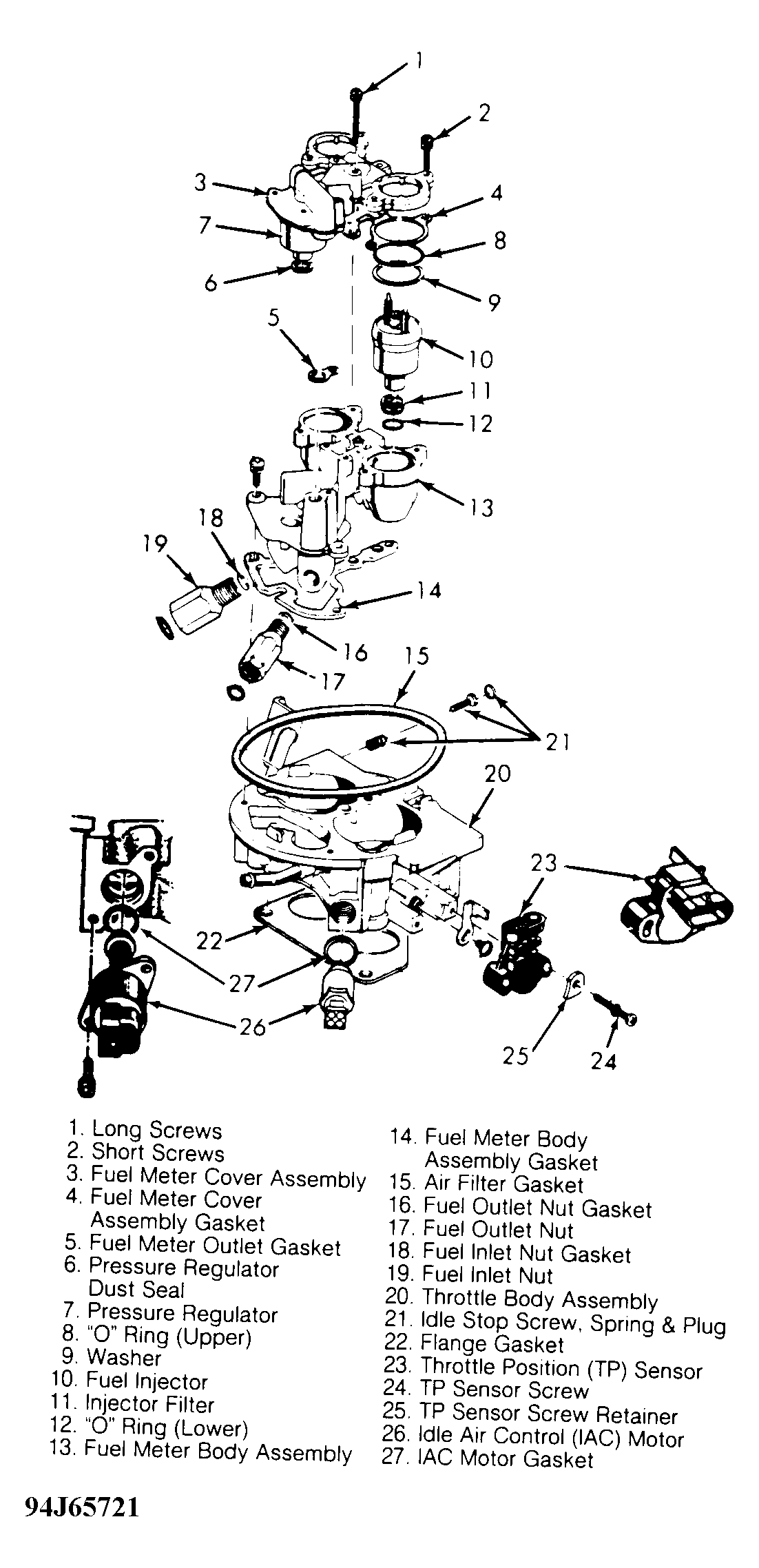 - Remove TP sensor, IAC, pressure regulator assembly, fuel injectors, fuel filter, rubber parts, and diaphragms. Clean all remaining (metal) parts in a cold immersion-type cleaner such as Carbon X (X-55). Blow dry with compressed air. Inspect mating surfaces for damage which may prevent gasket sealing. Repair or replace faulty components.