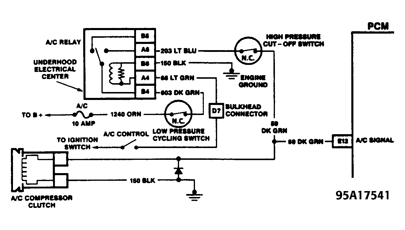 - Disconnect A/C clutch relay harness connector. Using proper mini-schematic and an ohmmeter, check continuity between A/C clutch relay winding terminals. See Figure. Continuity should exist. Check continuity between clutch drive circuit terminals of relay. Continuity should not exist.