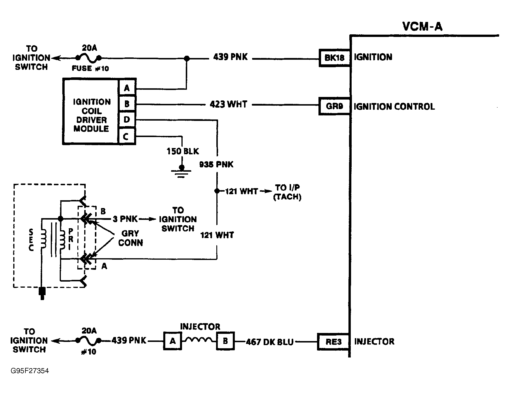4. Turn ignition off. Disconnect Gray VCM-A harness connector. Check for continuity between VCM-A ignition control connector terminal and ignition driver module connector terminal "B". If continuity is present, go to next step. If continuity is not present, check for open IC circuit between VCM-A and ignition coil driver module.