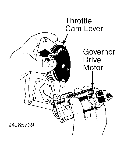 1. Hold throttle cam lever open at 11 o'clock position. See Fig 2. Remove mounting screws and remove governor drive motor. Release spring tension from governor drive lever. No other disassembly is possible.