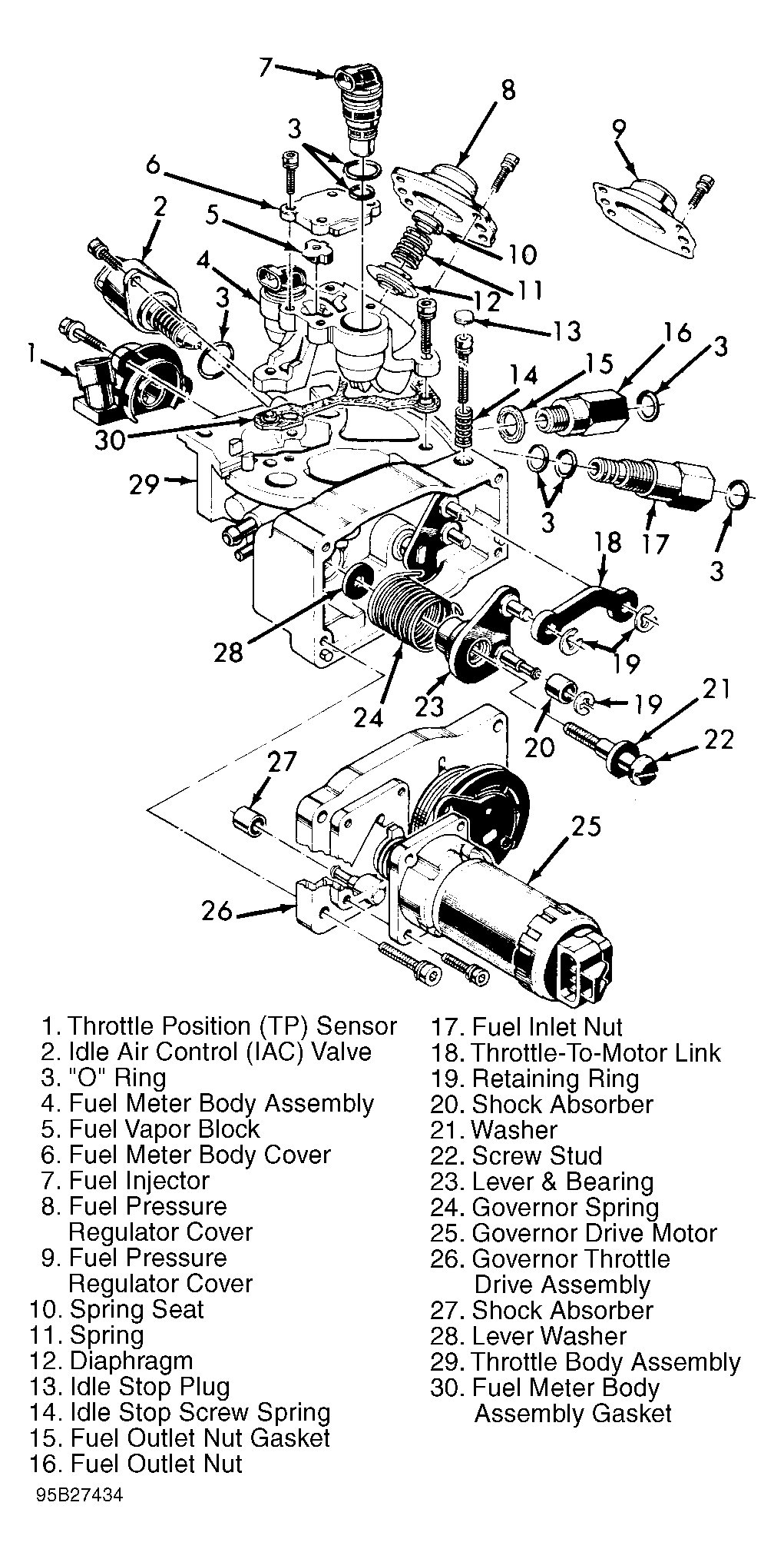 - Remove fuel injectors. Note location of fuel inlet and outlet nuts and remove. Discard gaskets and "O" rings. Remove fuel meter body assembly-to-throttle body screws. See Figure. Remove fuel meter body assembly. Remove and discard fuel meter body assembly gasket.