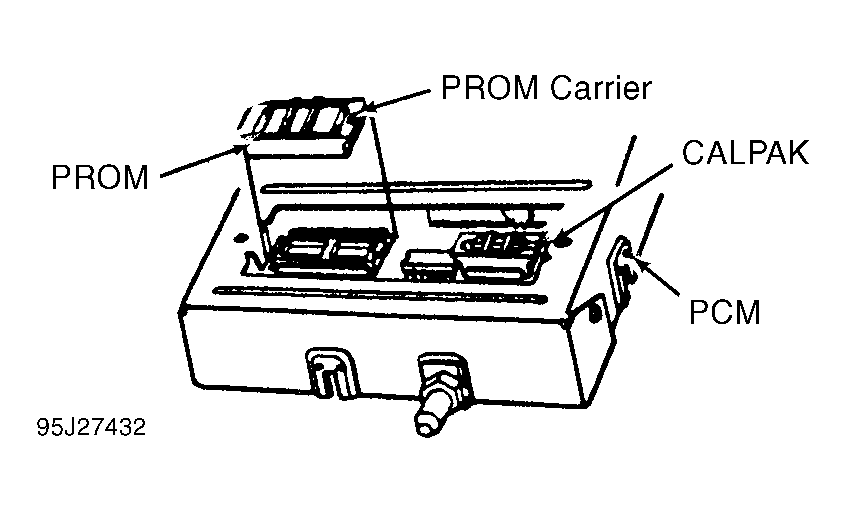 Some PCM's use a CALPAK as well as a PROM. See Fig 1. The CAL PAK must also be removed from old PCM and installed in new one. Removal and replacement procedures for CALPAK are same as for PROM. See PROGRAMMABLE READ-ONLY MEMORY (PROM). If CALPAK is installed improperly, grounding DLC diagnostic test terminal will cause DTC 52 to set.