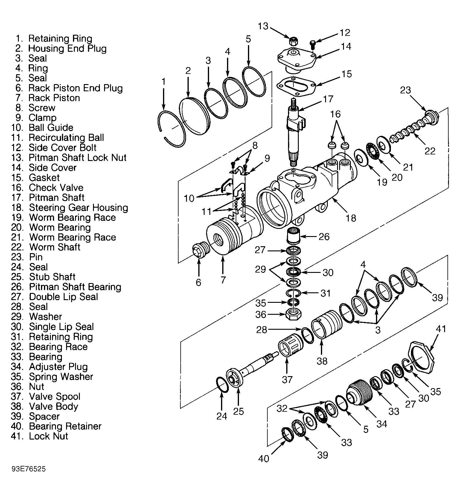 Steering gear is a variable ratio, recirculating ball-type which acts as a rolling thread between worm shaft and rack piston. The worm shaft is supported at lower end by a thrust bearing with 2 races. It is supported at upper end by a bearing assembly in the adjuster plug. Control valves, located inside steering gear housing, direct power steering fluid to either side of rack piston. See Fig 1 .