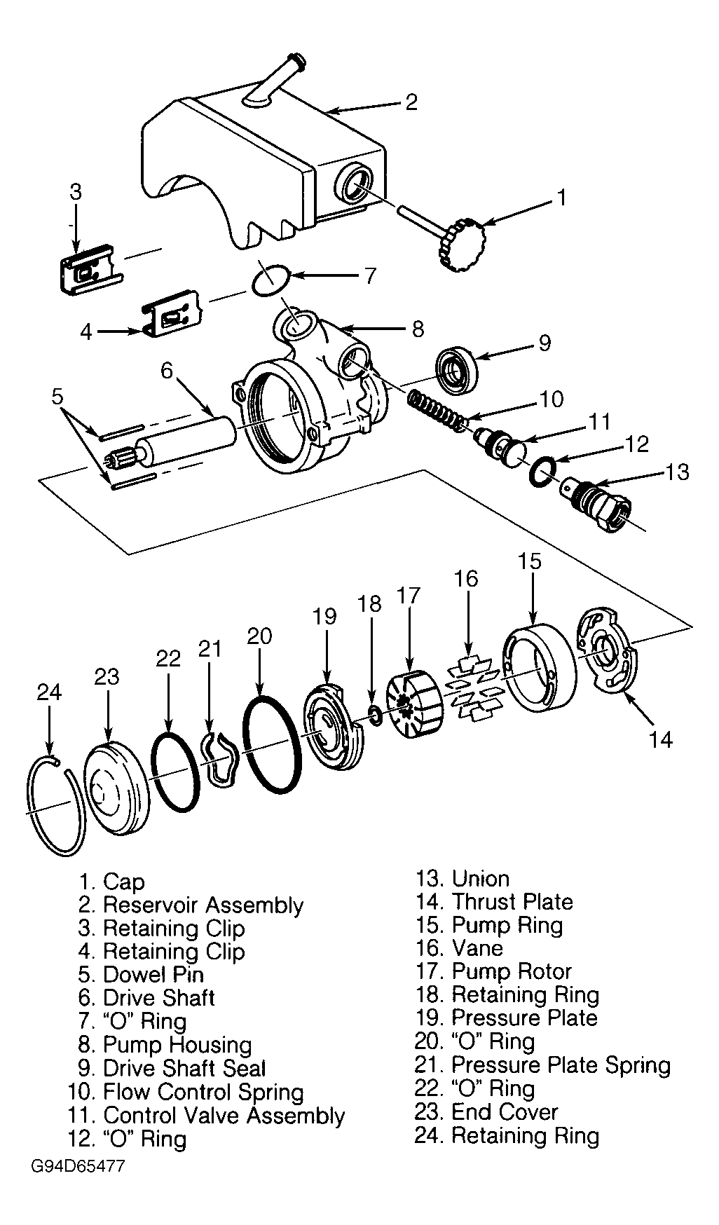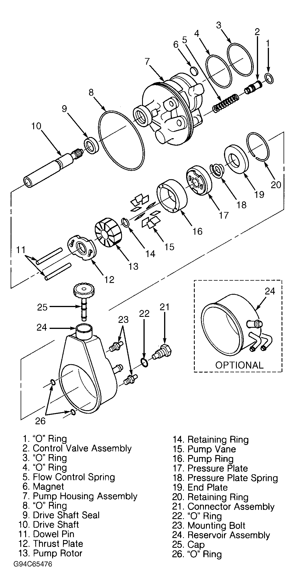 Two different types of vane-type power steering pumps are used. The Model "P" pump is mounted inside reservoir. See Figure . The Model "CB" pump is mounted below reservoir. See Figure . On both models, vanes are driven by a rotor and move fluid from intake to pressure cavities of pump ring.