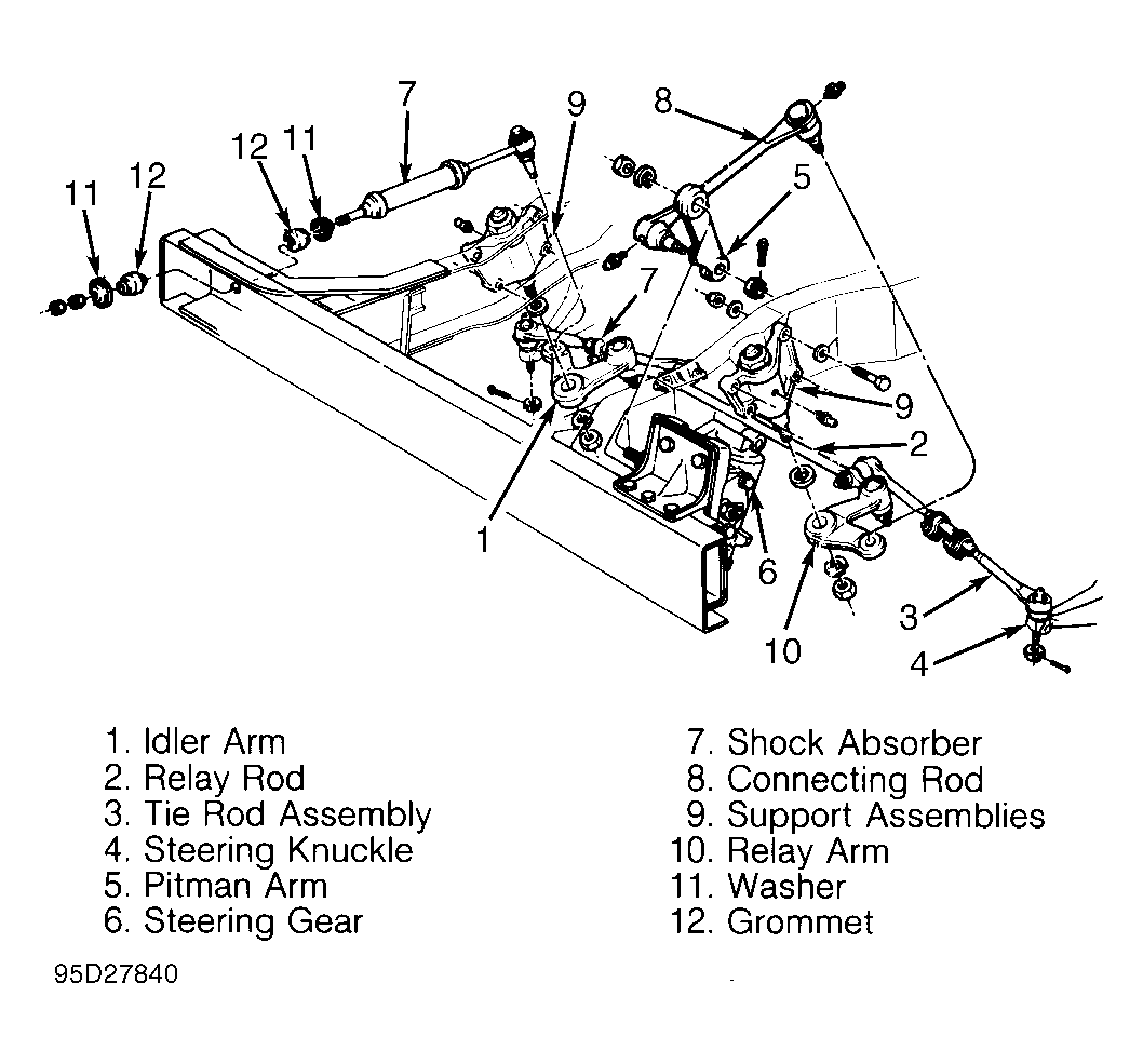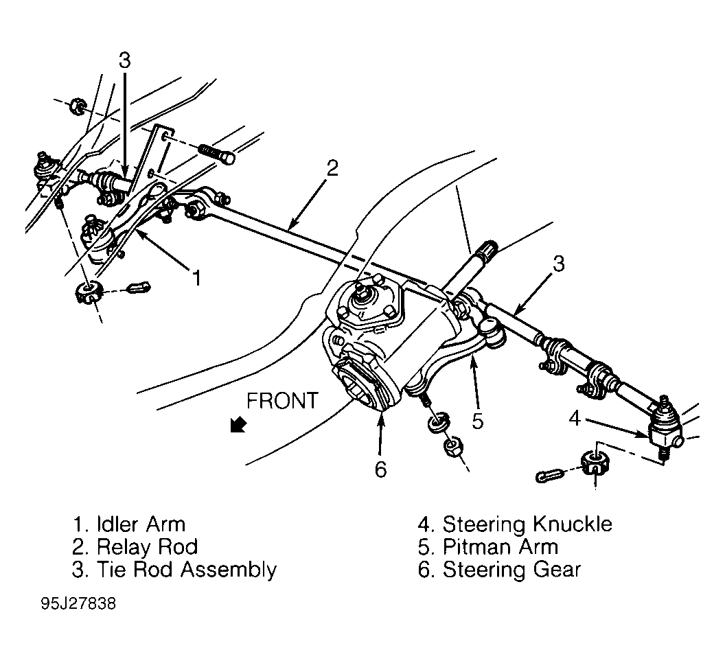 Steering linkage connects steering gear to front wheels through pitman arm. Steering linkage consists of pitman arm, idler arm, relay rod and tie rods. See Fig 2 through Fig 4 . Tie rod ends connect to relay rod by ball studs. Adjuster tubes between inner and outer tie rod ends are used to adjust toe. Some models have a shock absorber attached to relay rod.