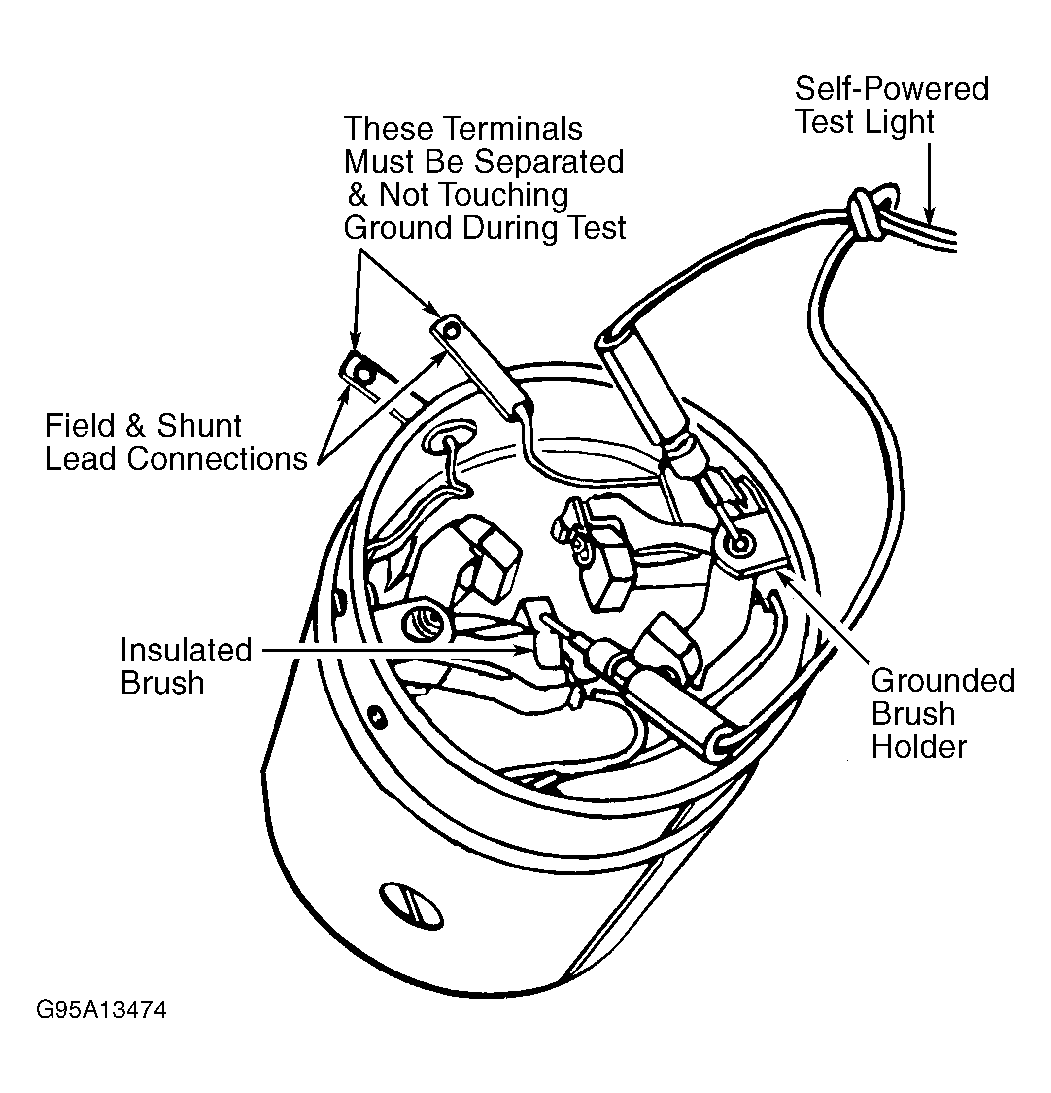 Remove armature from field and frame assembly. On starters with shunt lead, separate field and shunt lead connections during test. Ensure field lead connection is NOT touching ground during test. Using self-powered test light, place one lead on grounded brush holder and other lead on one insulated brush. See Fig 1. Test light should not illuminate. If test light illuminates, field coil is grounded. Replace field and frame assembly. Repeat test for each insulated brush.