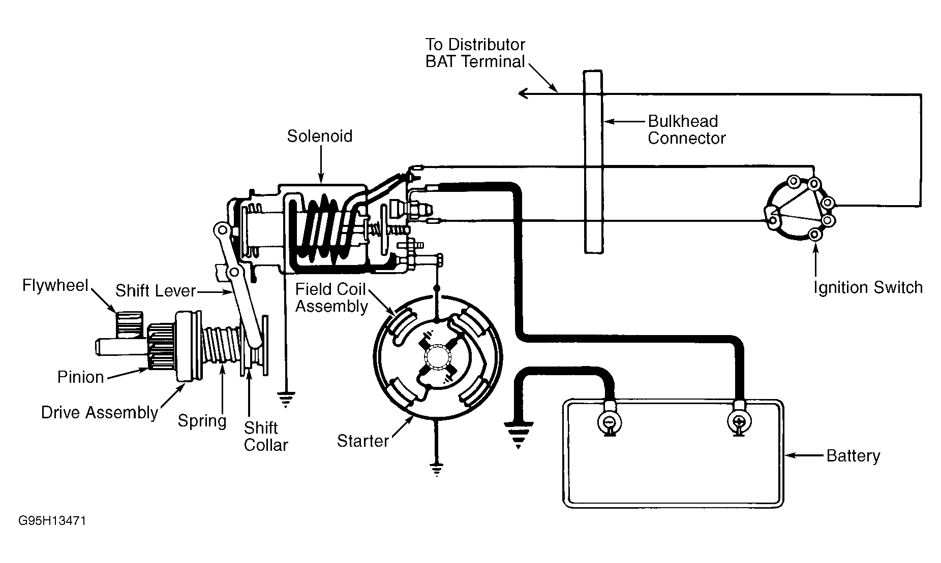 When the ignition switch is turned to the START position, the Delco-Remy starter solenoid windings are energized. This causes the solenoid plunger to move the shift lever, which engages the pinion with the engine flywheel ring gear. The movement of the plunger also closes the main solenoid contacts, applying battery voltage to the starter motor. See Fig 1.