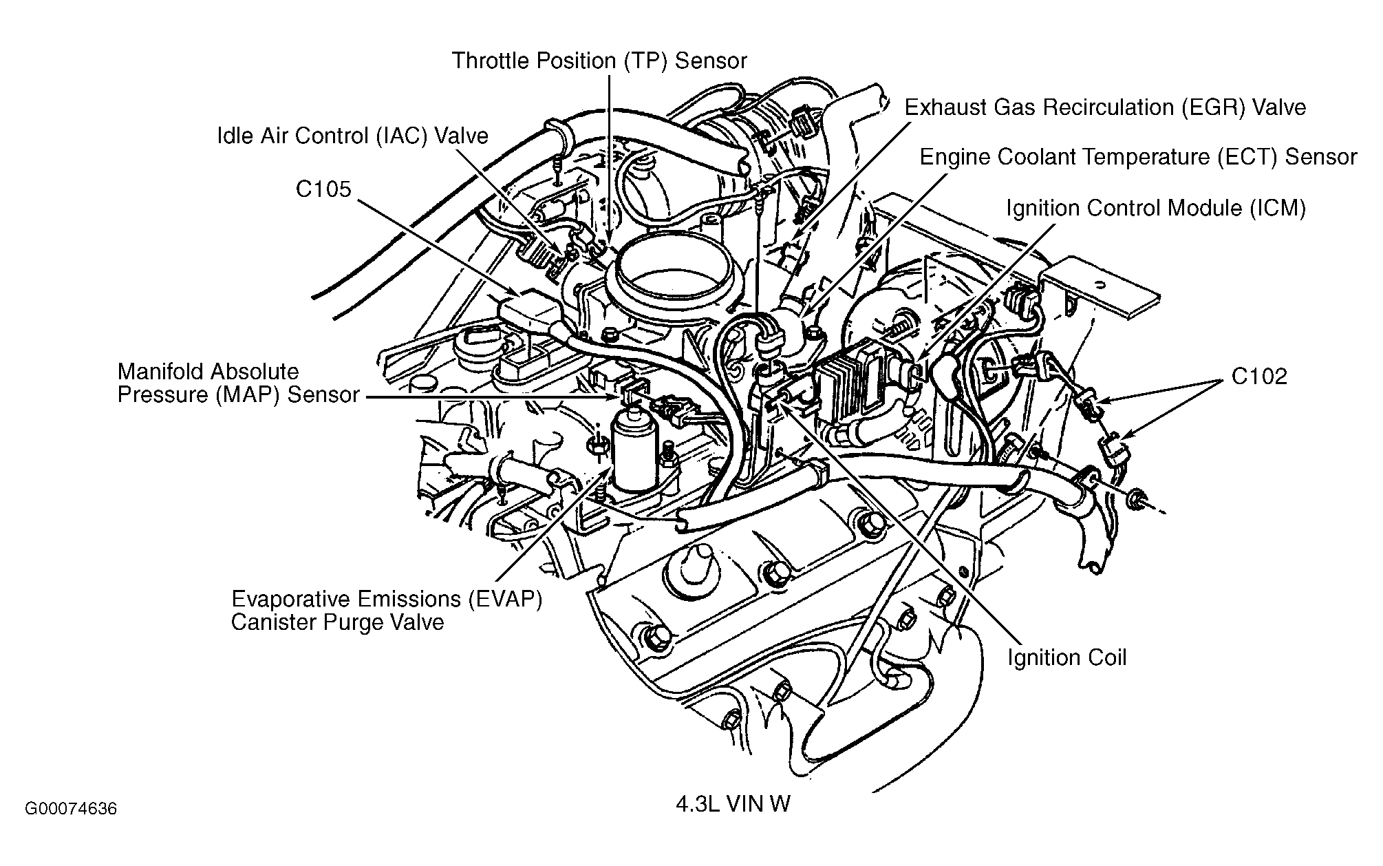 | Ignition Control Module (ICM) (4.3L VIN W) | On right top of engine, at ignition coil. See Figure. |