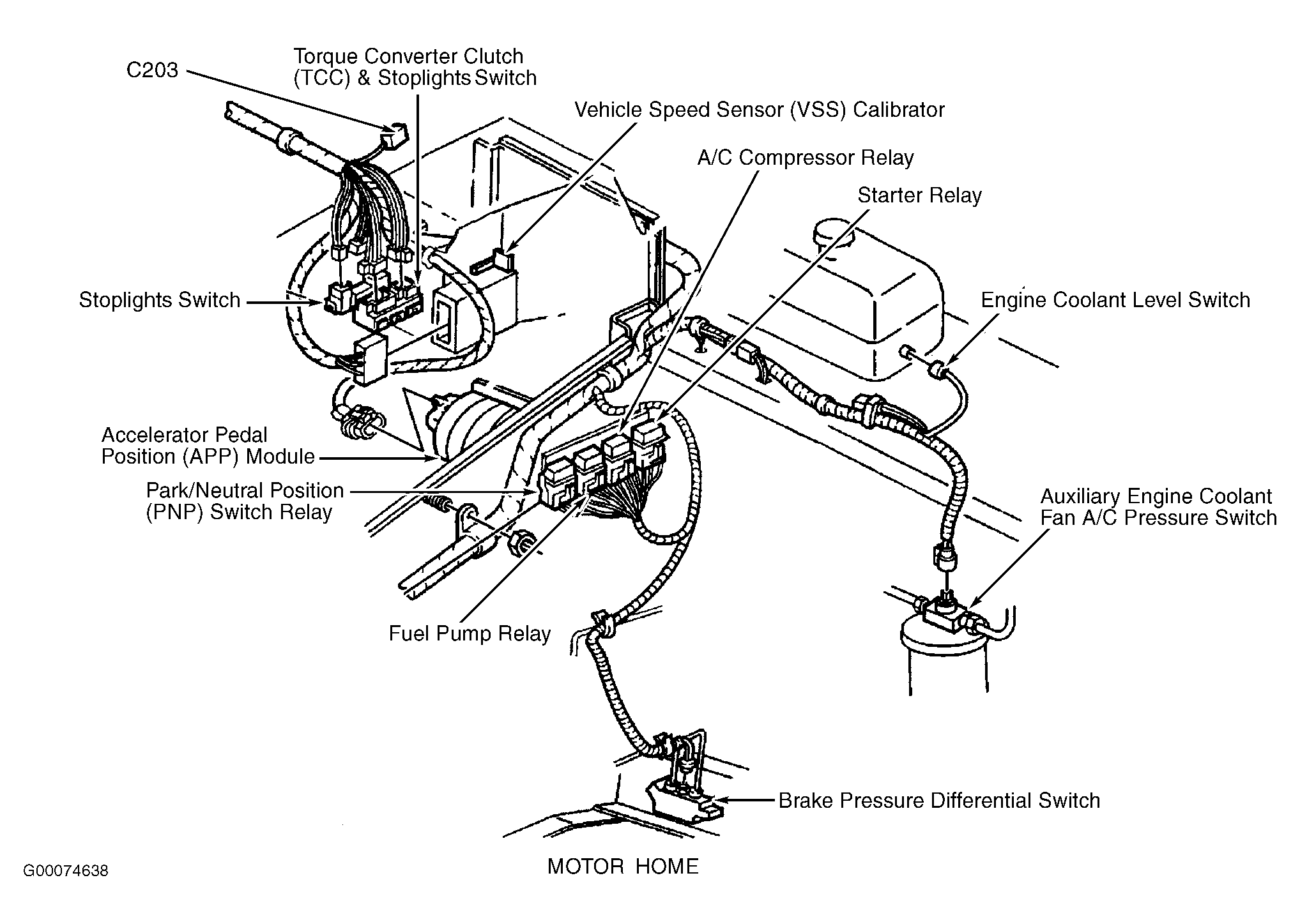 | Vehicle Speed Sensor (VSS) Calibrator (Motor Home) | On left side of driver's island, under relay bracket. See Figure. |