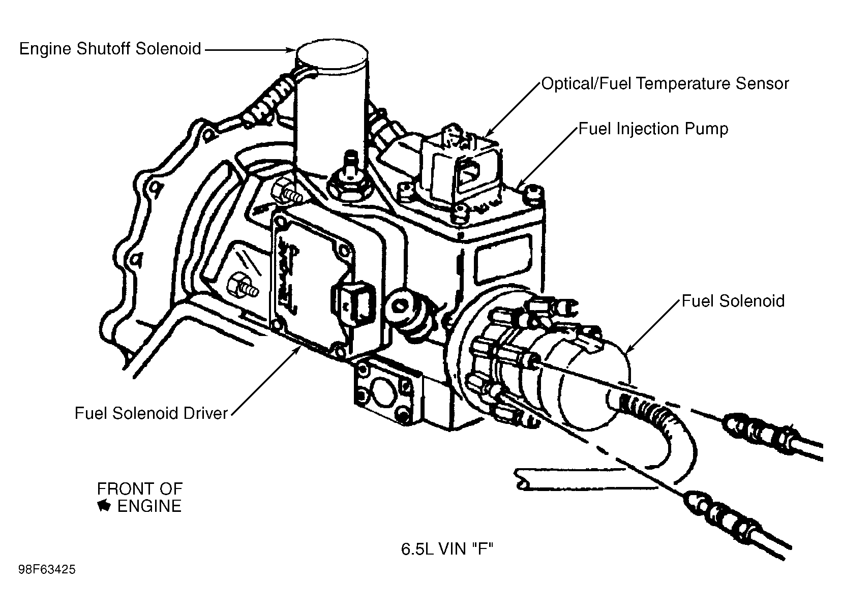 | Fuel Solenoid Driver (6.5L VIN F) | On side of fuel injection pump. See Figure. |