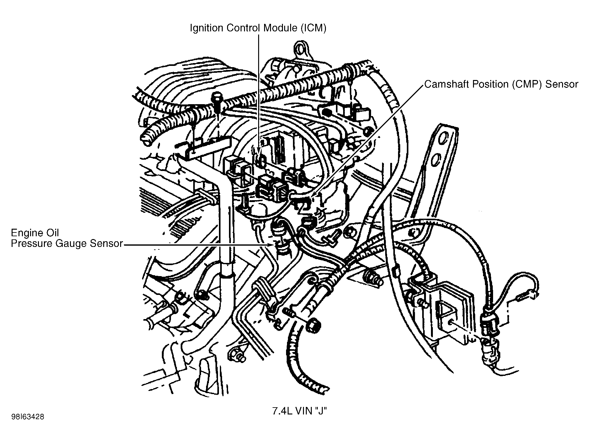 | Ignition Control Module (ICM) (7.4L VIN J) | On bracket at rear of intake plenum. See Figure. |