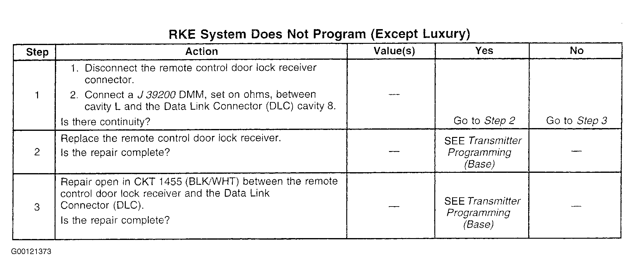 Test K: Remote Keyless Entry System Does Not Program (Except Luxury)