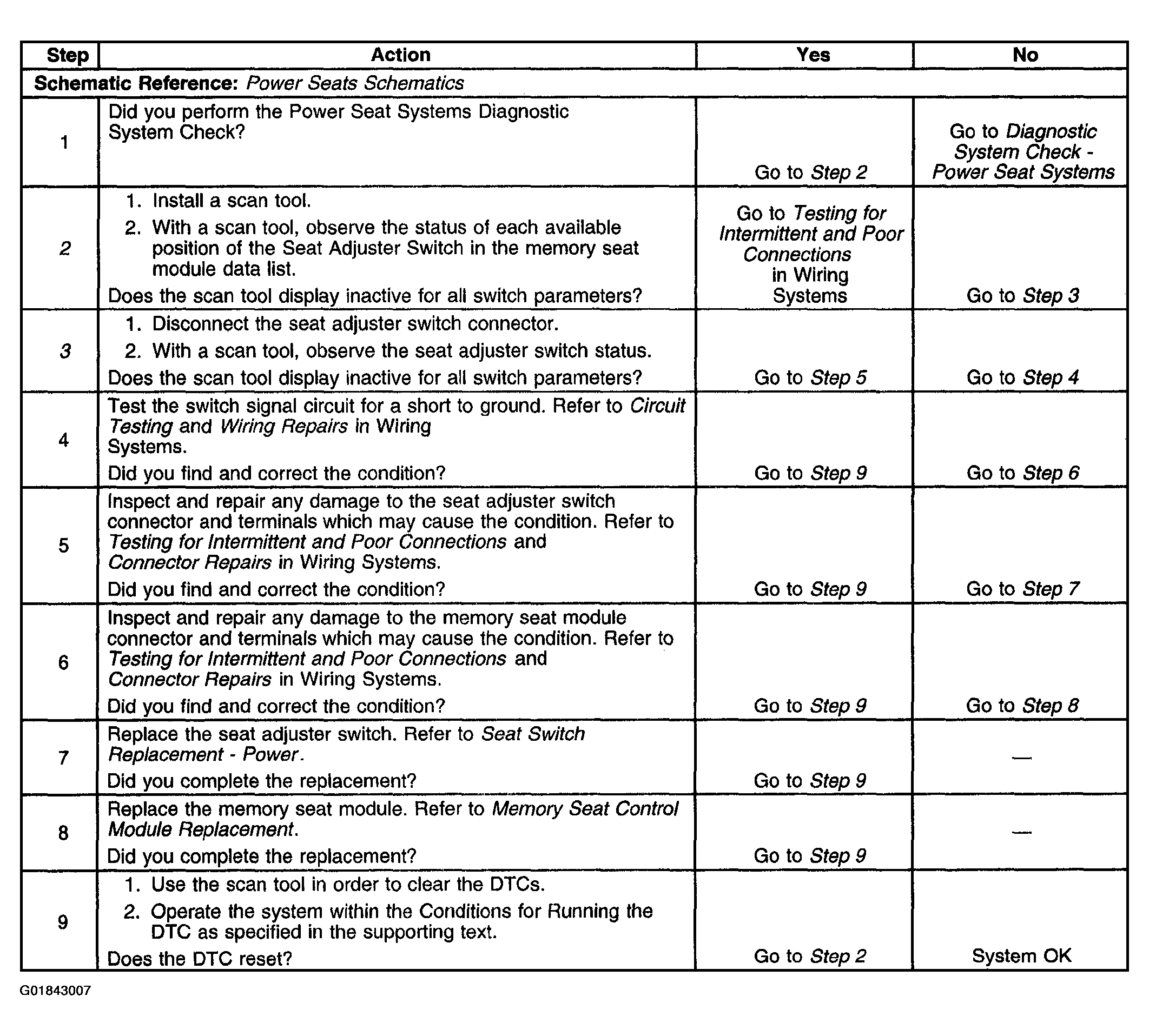 Tests the seat adjuster switch for an internal fault.