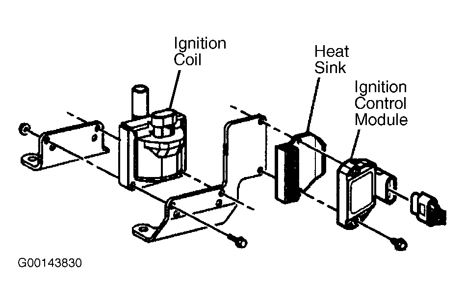 Turn ignition off. Disconnect harness connector at ignition control module. See Figure. Remove screws retaining ignition control module and heat sink to bracket. Remove ignition control module and heat sink.