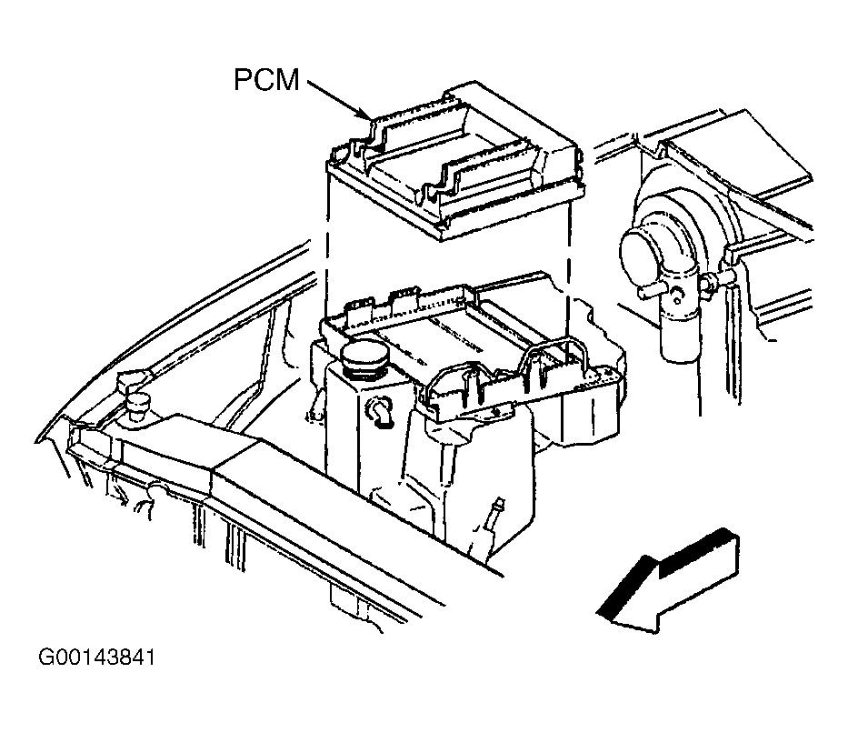 Ensure ignition is off. Disconnect negative battery cable. Locate PCM in right side of engine compartment. See Fig 1. Move the PCM retention bar and retainer away from the PCM. Remove the PCM from the PCM mounting bracket. Disconnect harness connectors from PCM. Remove PCM from vehicle.