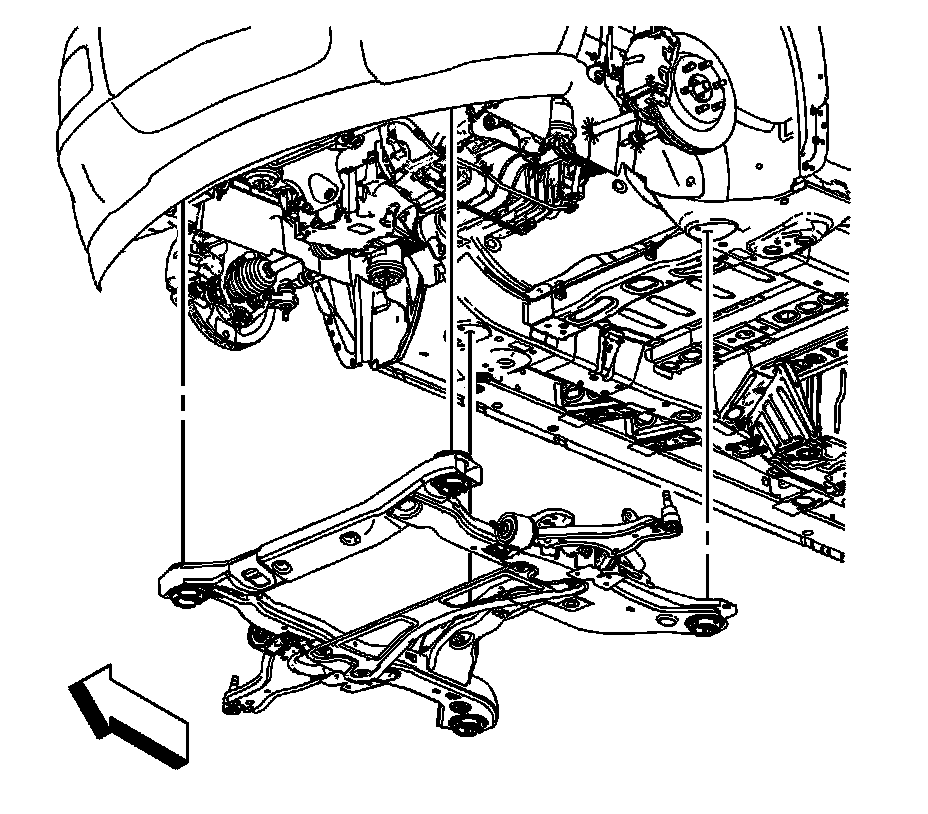 7. Lower the vehicle while aligning the powertrain mounts with the frame until the vehicle is close to the frame.