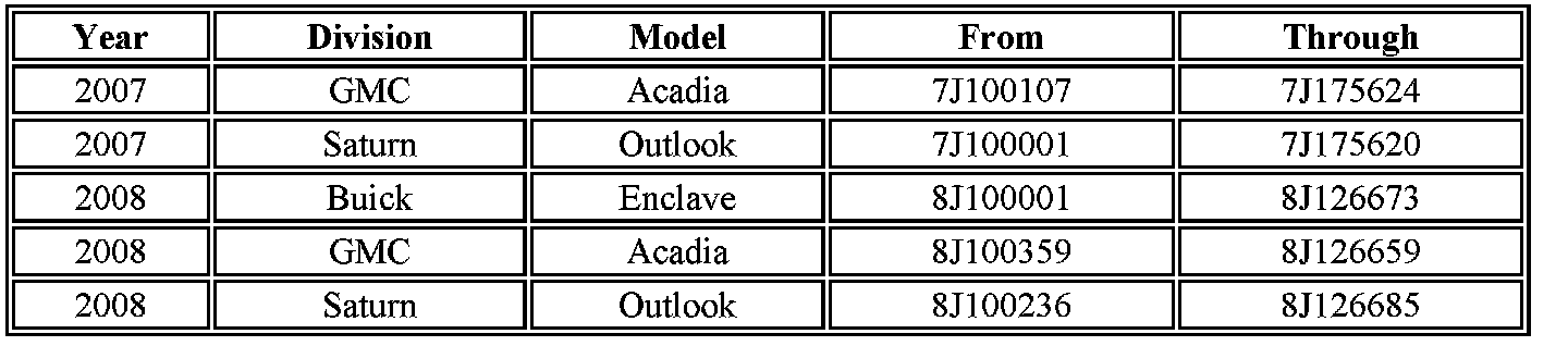 Involved are certain 2007-2008 GMC Acadia; Saturn Outlook and 2008 Buick Enclave model vehicles built within the VIN breakpoints shown.