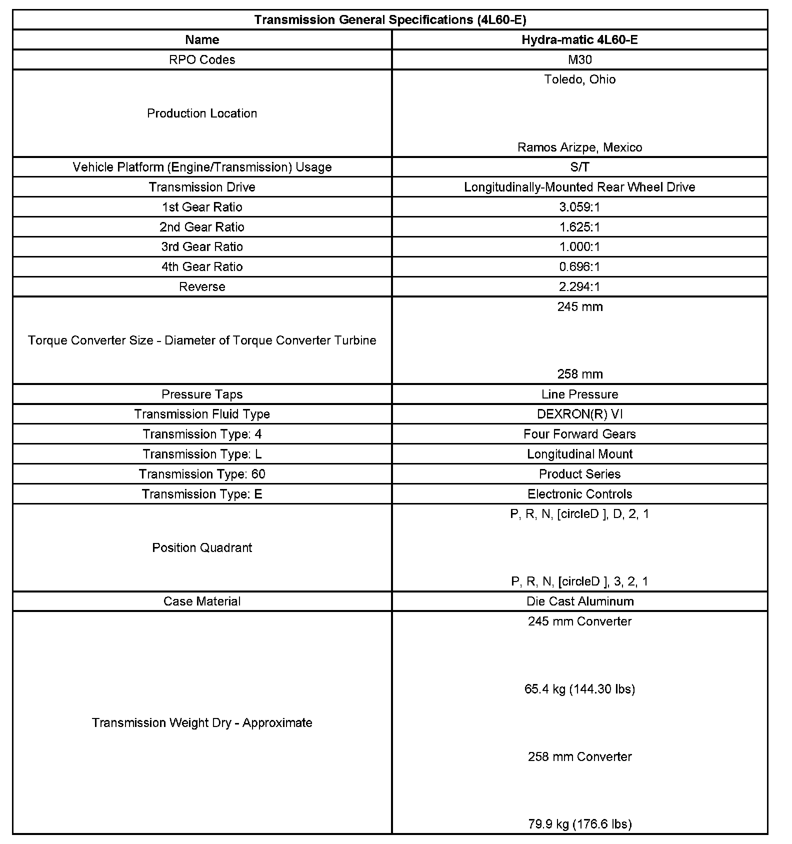 Transmission General Specifications: