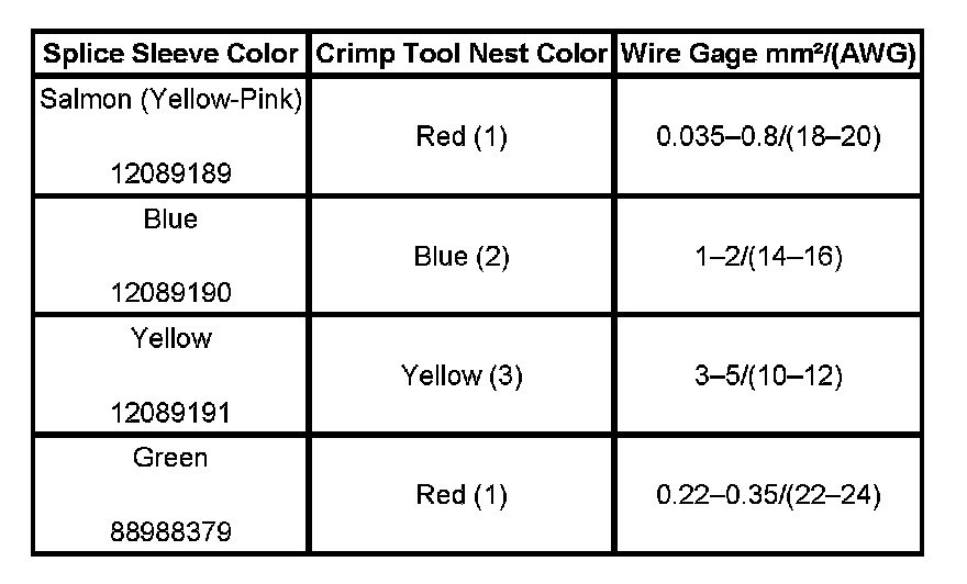 6. Select the proper DuraSeal splice sleeve according to the wire size. Refer to the above table at the beginning of the repair procedure for the color coding of the DuraSeal splice sleeves and the crimp tool nests.