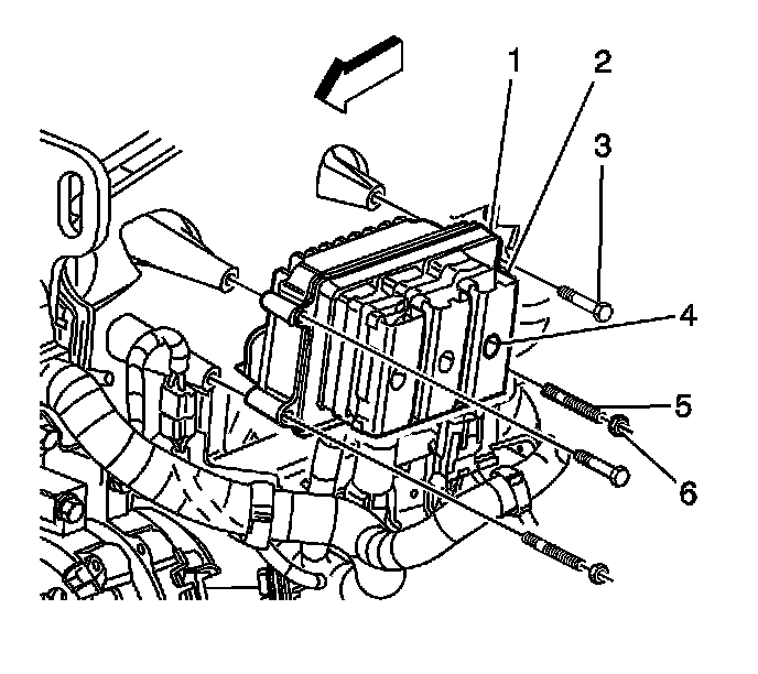 5. Slide the PCM (1) away from the intake manifold past the mounting studs (5) and remove PCM from the vehicle.