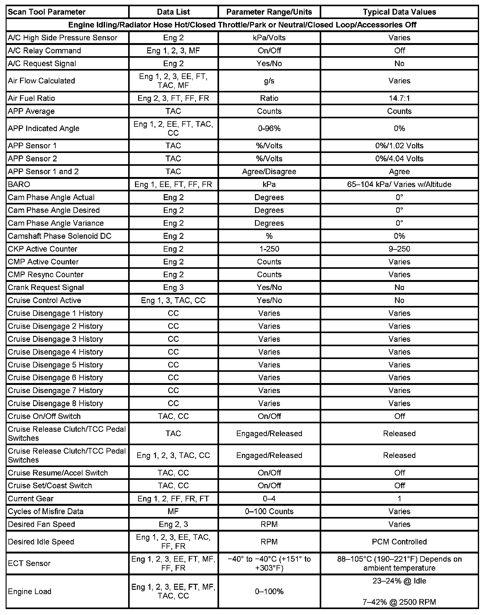 The Engine Scan Tool Data List contains all engine related parameters that are available on the scan tool. The list is arranged in alphabetical order. A given parameter may appear in any one of the data lists, and in some cases may appear more than once, or in more than one data list in order to group certain related parameters together.