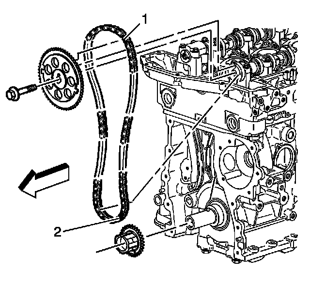 Install the timing chain onto the crankshaft sprocket. Align the - dark link of the timing chain with the timing mark on the crankshaft sprocket (2).