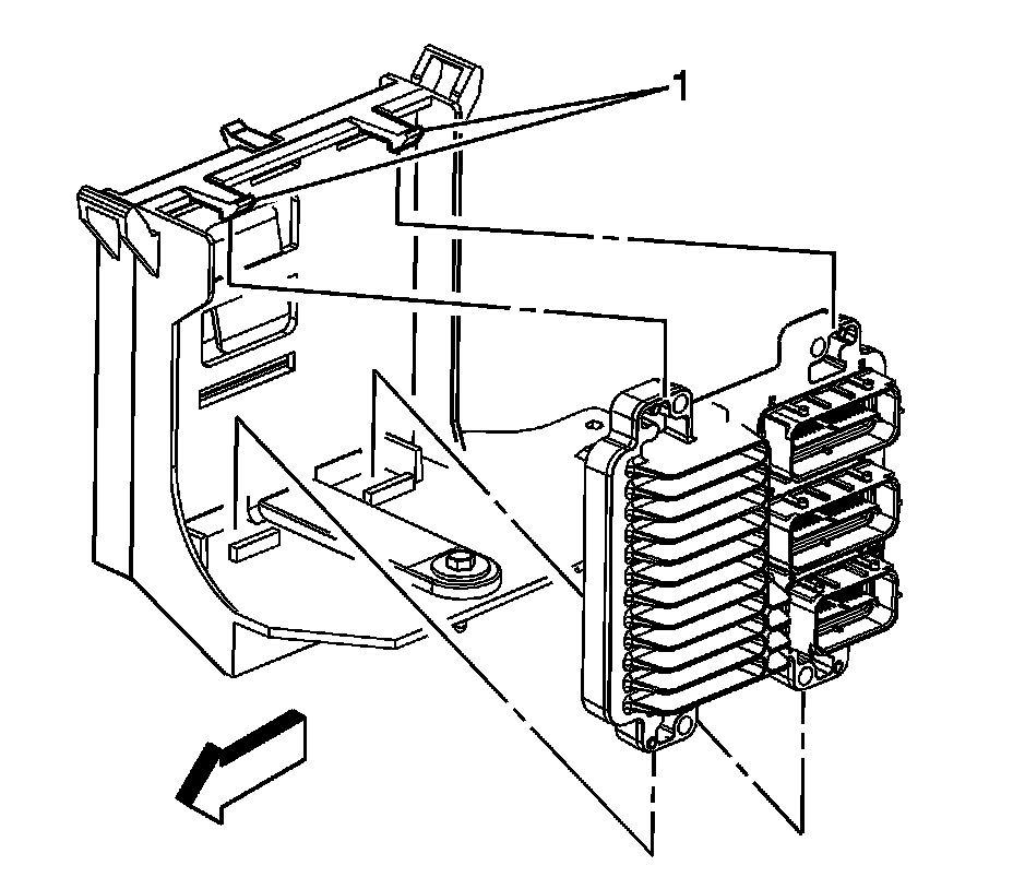 6. Secure the ECM to the bracket ensuring that the ECM retaining tabs (1) are fully engaged.