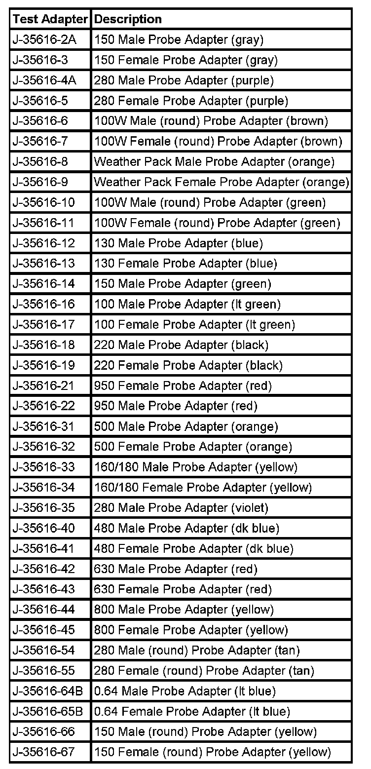 Important: When probing female 0.64 terminals, it is important to use the correct adapter. There have been some revisions to the test adapter for 0.64 terminals. The proper adapter for 0.64 terminals is the J 35616-64B which has a gold terminal and a black wire between the base and tip. Failure to use the proper test adapter may result in damage to the terminal being tested and improper diagnosis.
