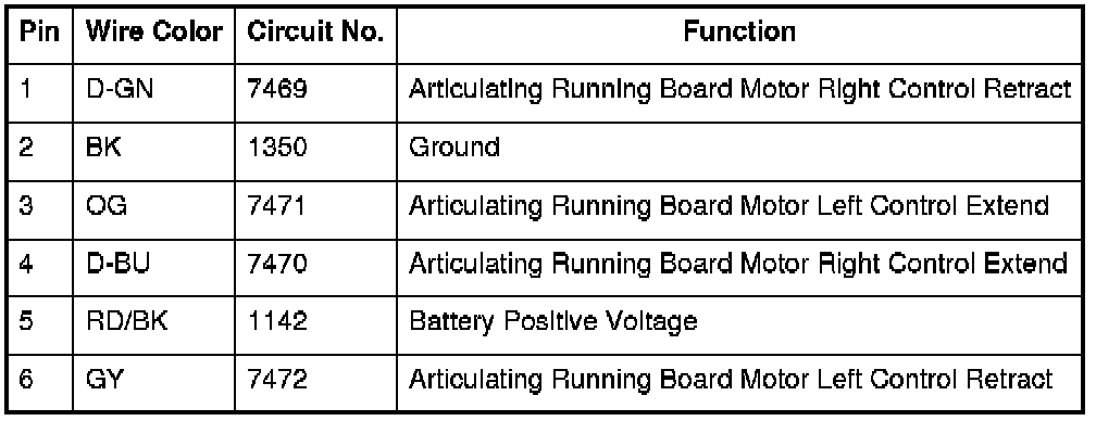 Table2: Assist Step Control Module C1 Assist Step Control Module C1 Table4: Assist Step Control Module C2 Table6: I/P Multifunction Switch Assembly (X88/Z88) Table8: I/P Multifunction Switch Assembly (Z75) Table10: Running Board - Left Table12: Running Board - Right