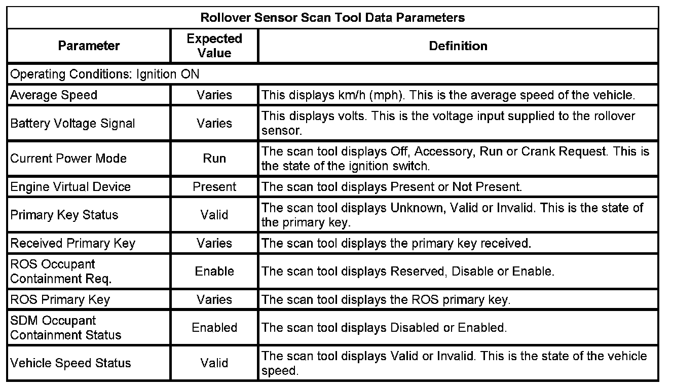 Inflatable Restraint Vehicle Rollover Sensor Scan Tool Information