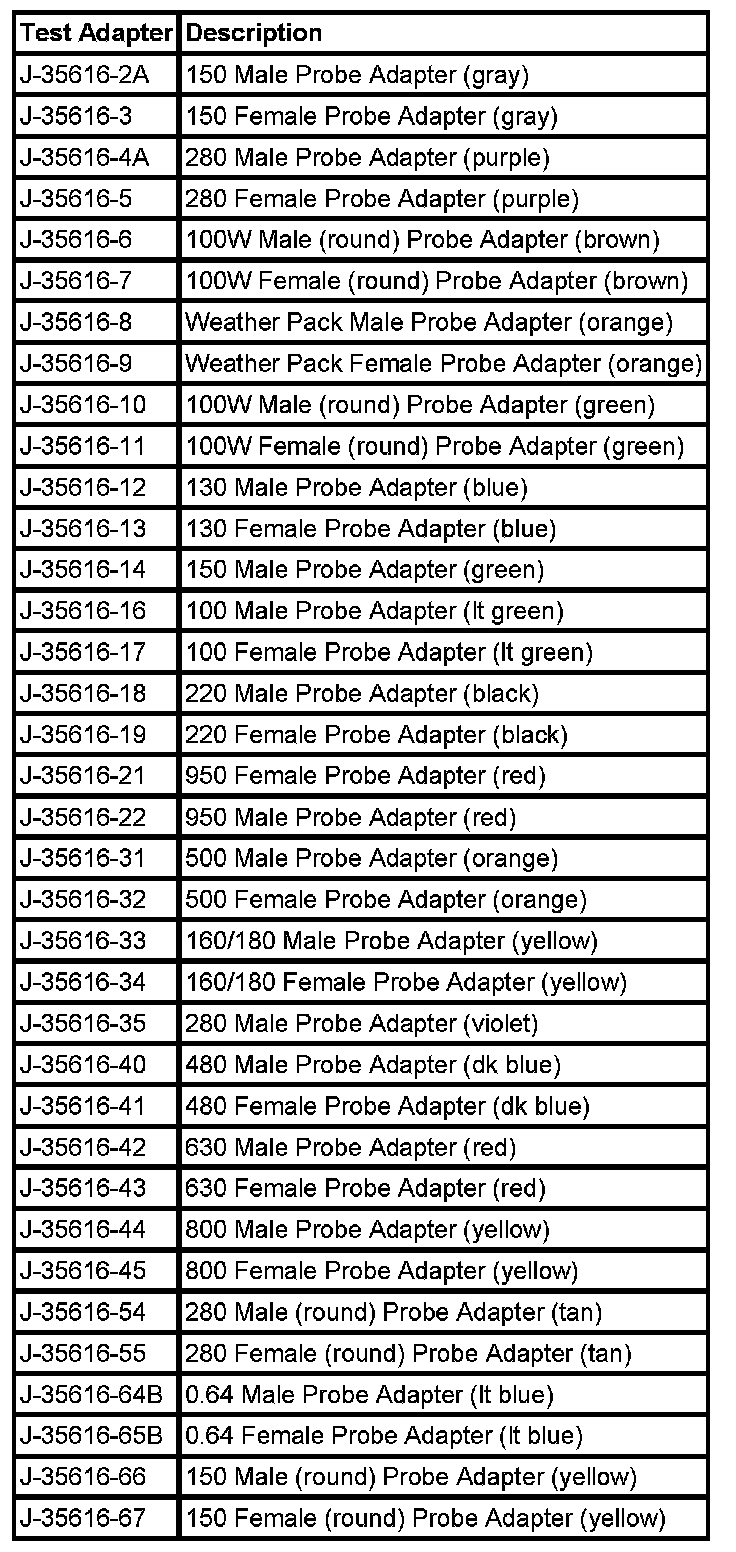 Important: When probing female 0.64 terminals, it is important to use the correct adapter. There have been some revisions to the test adapter for 0.64 terminals. The proper adapter for 0.64 terminals is the J 35616-64B which has a gold terminal and a black wire between the base and tip. Failure to use the proper test adapter may result in damage to the terminal being tested and improper diagnosis.