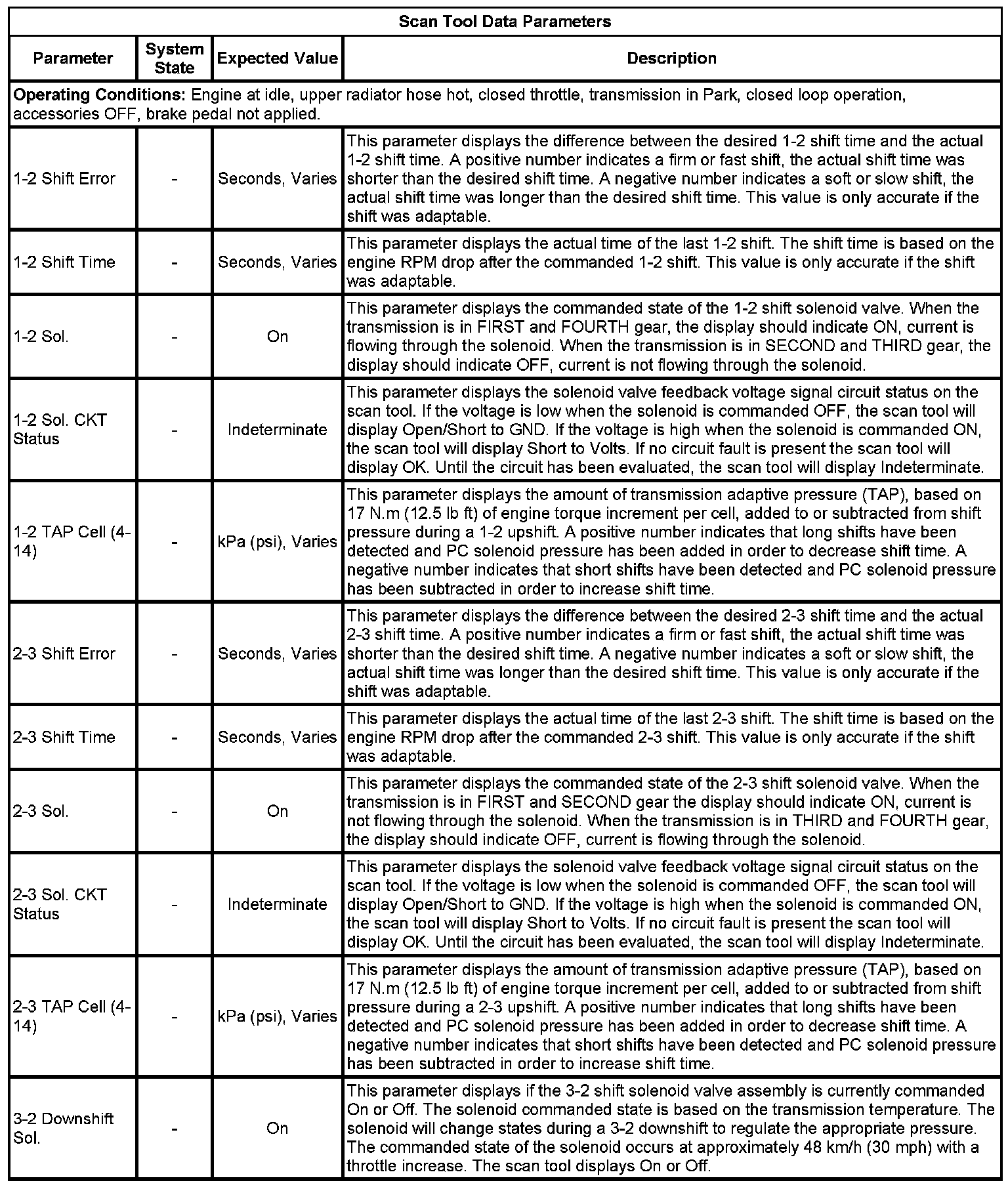 The scan tool values from a properly functioning transmission may be used for comparison with the transmission you are diagnosing. The values below represent a typical display recorded from a properly functioning system.