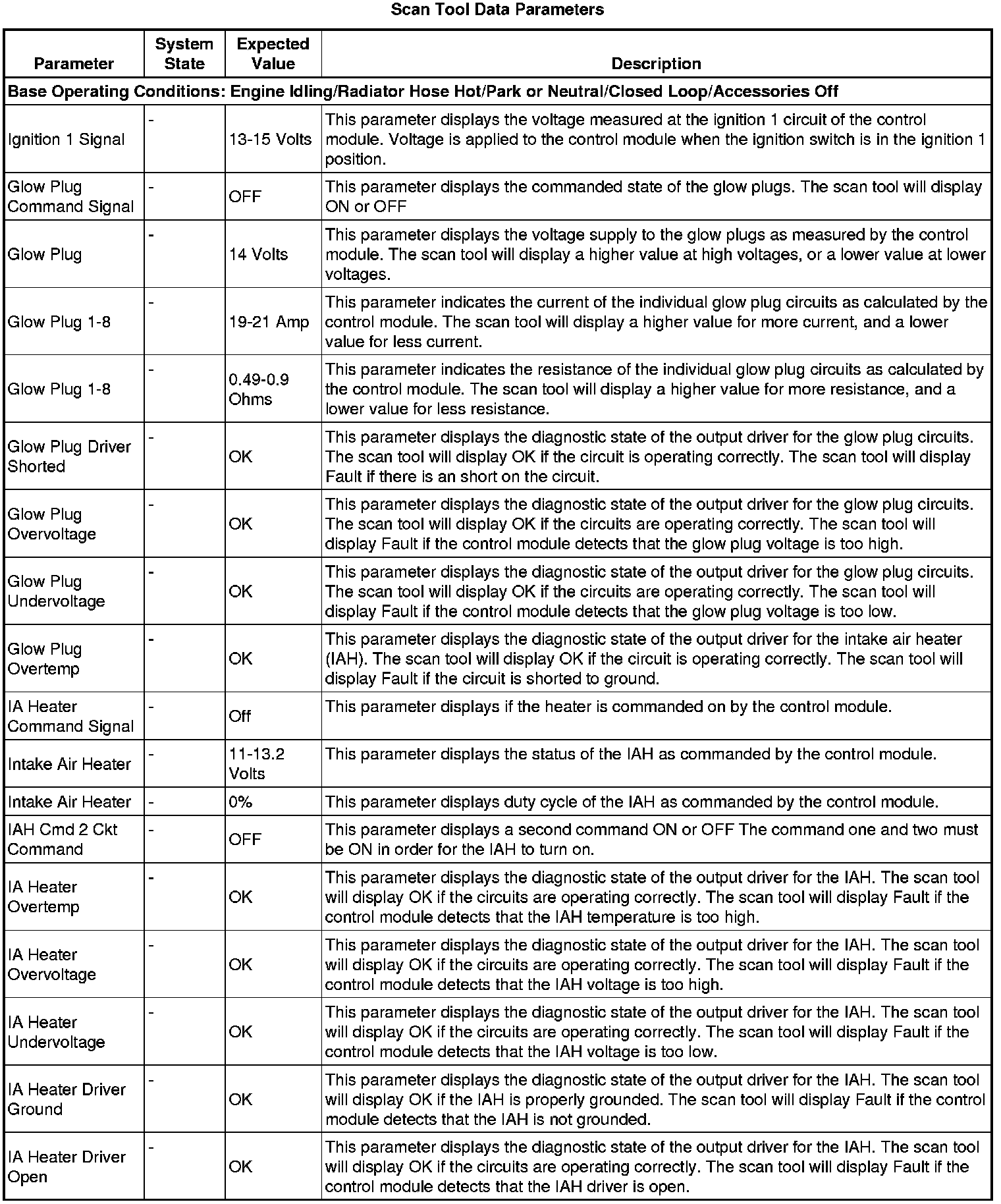Home >> GMC >> 2009 >> Sierra Denali AWD V8-6.2L >> Repair and Diagnosis >> Testing and Inspection >> Scan Tool Testing and Procedures >> Glow Plug Control Module Scan Tool Information