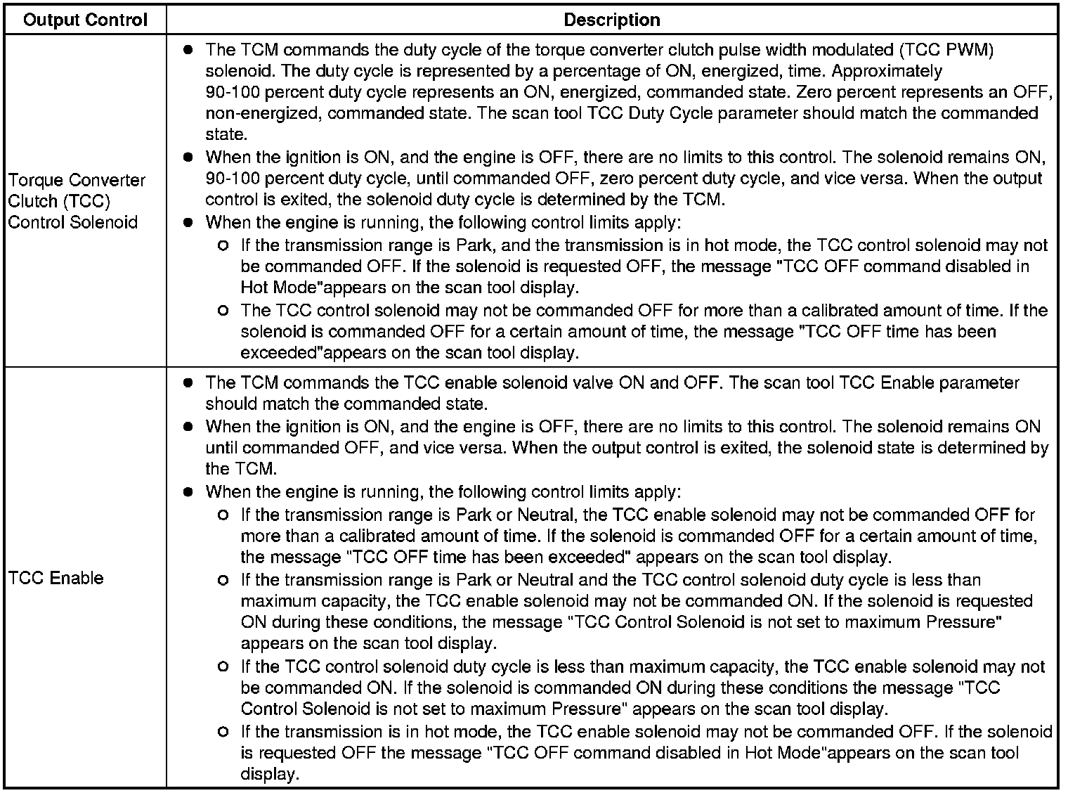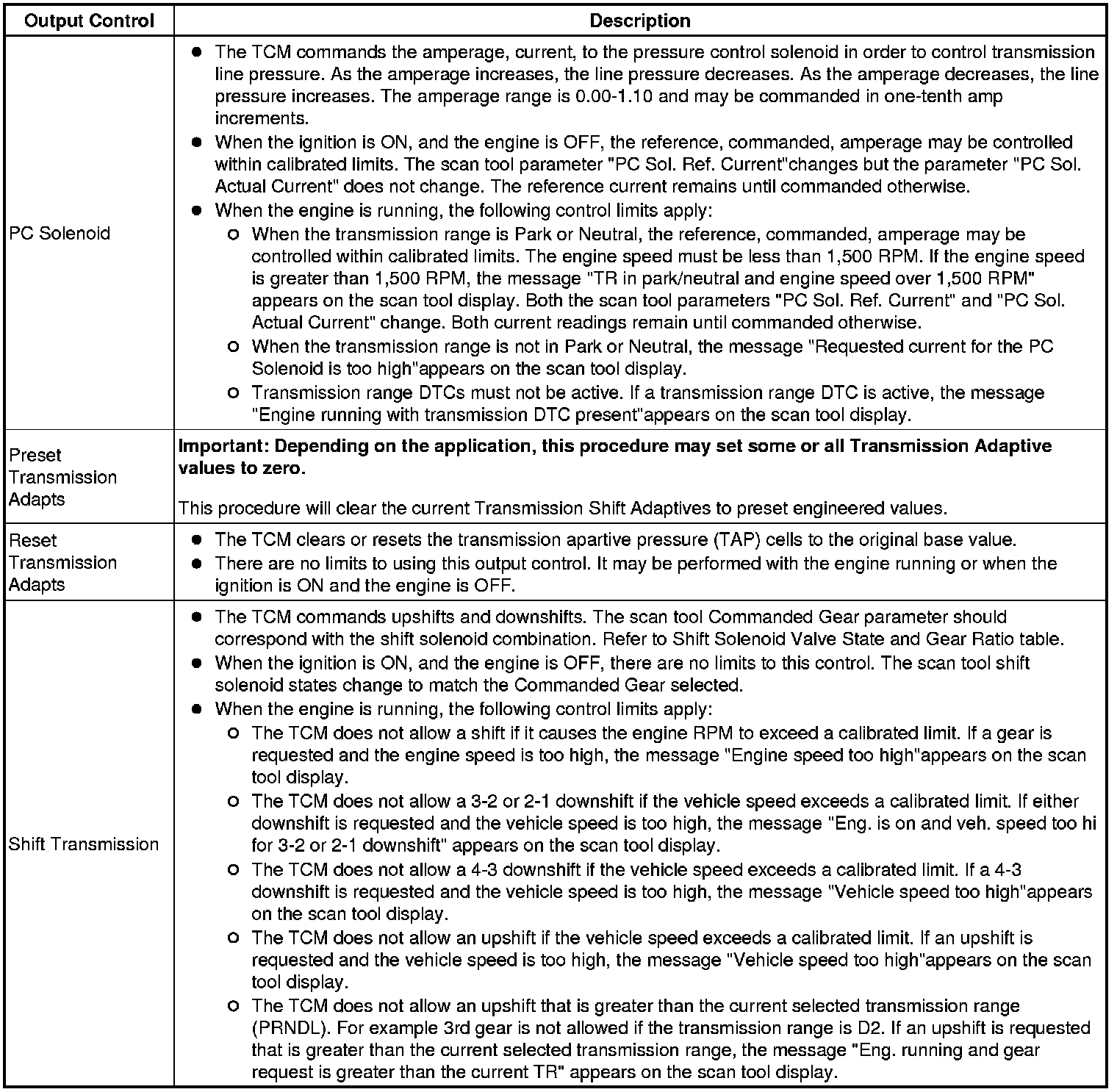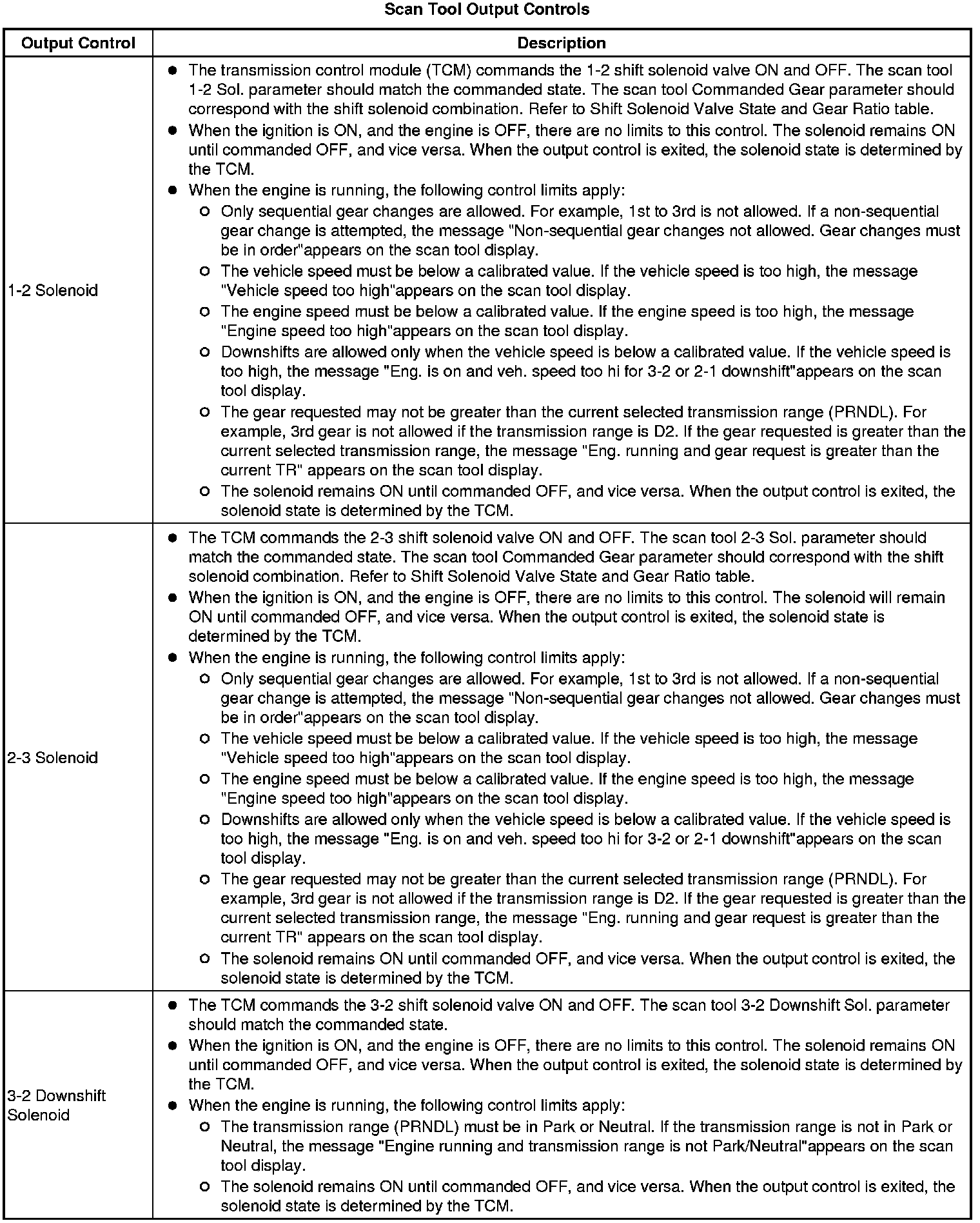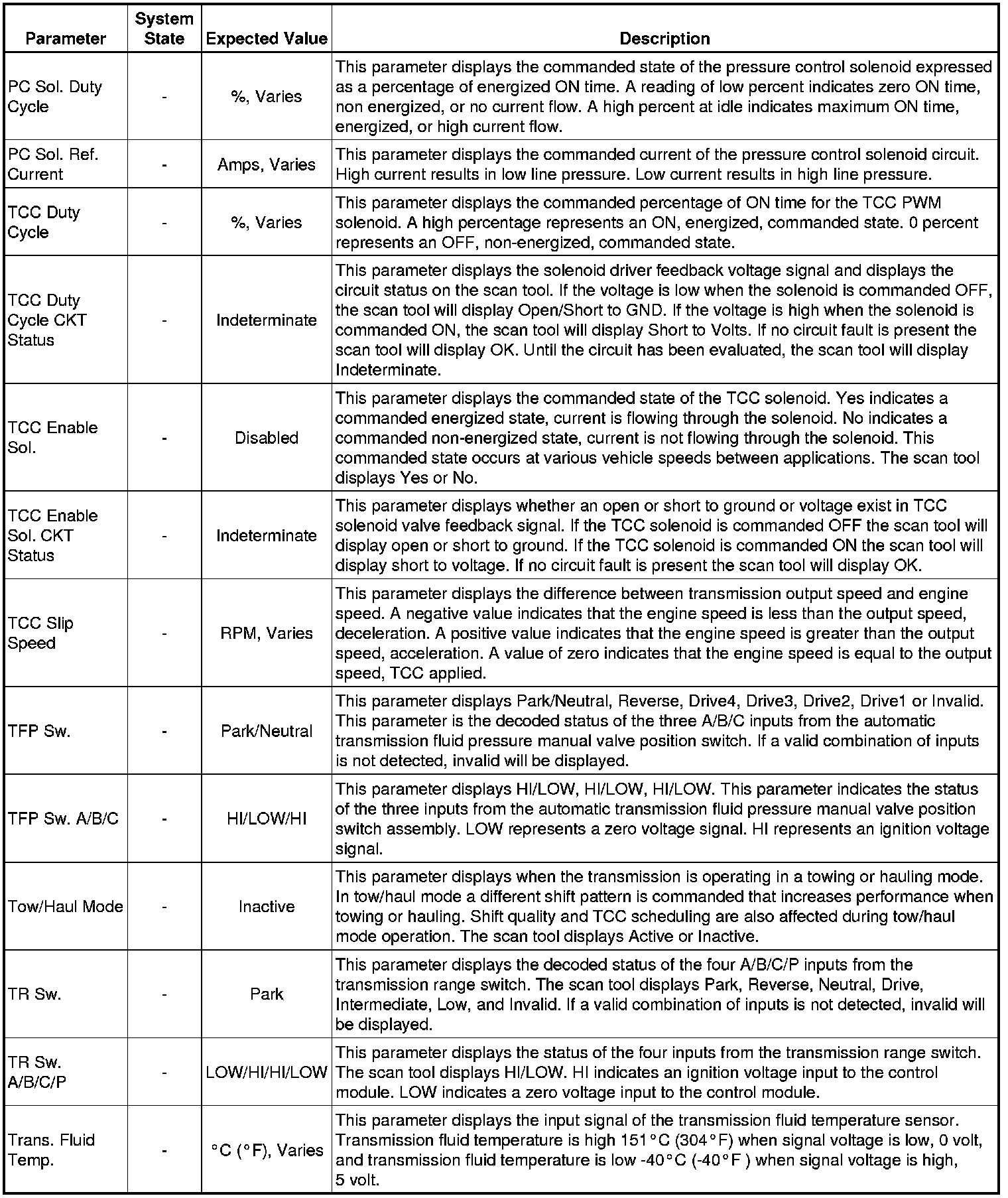 The Transmission Control Module Scan Tool Data List contains all transmission related parameters that are available on the scan tool. The list is arranged in alphabetical order. A given parameter may appear in any one of the data lists, and in some cases may appear more than once, or in more than one data list in order to group certain related parameters together.