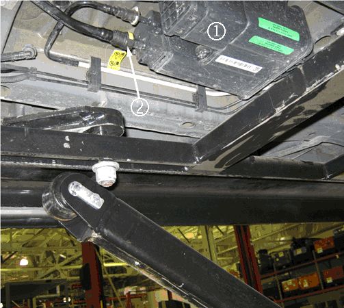 2. Locate the fuel tank EVAP emissions canister (1) and fuel tank EVAP vapor line connection (2).