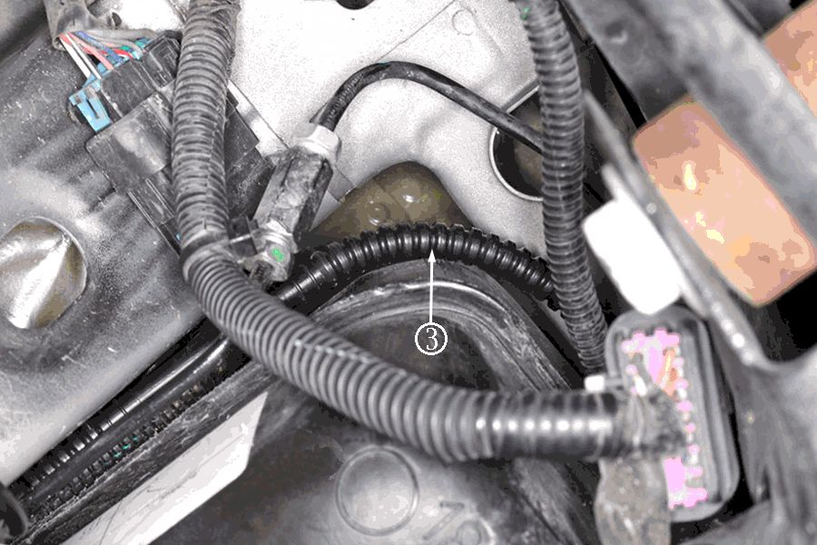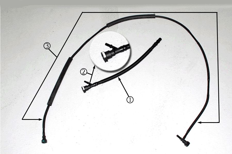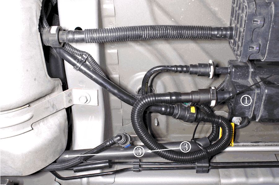 6. Install the second piece of the new 8 mm (5/16 in) jumper hose (smaller diameter hose) (3) to the 45 degree T-fitting on the new 16 mm (5/8 in) EVAP jumper hose (2). Ensure that the new 8 mm (5/16 in) jumper hose (3) is installed between the new 16 mm (5/8 in) EVAP jumper hose (2) and floor pan.