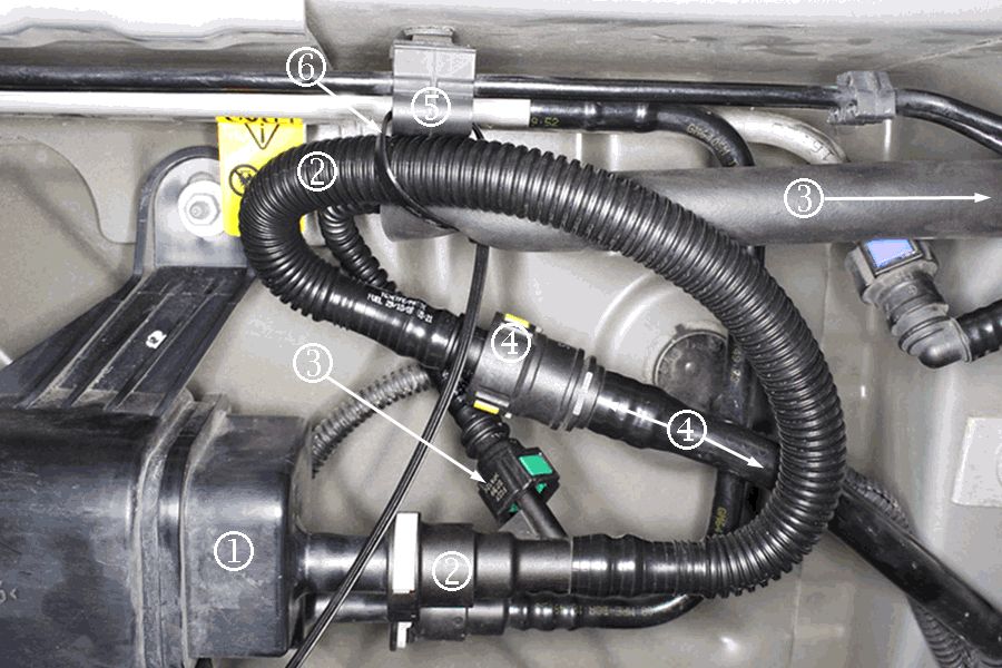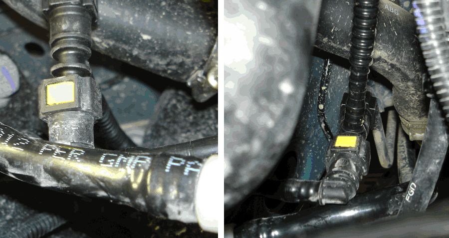 12. Disconnect the existing EVAP-to-fuel tank vapor line (yellow connector) located on the rear right (passenger side) of vehicle at the fuel tank.