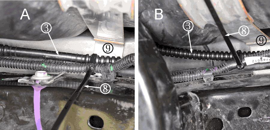 15. Secure the 8 mm (5/16 in) hose (3) to the parking brake line at the left (driver's) (A) and right (passenger' side) (B) fuel tank strap locations (9) with two tie straps (8) as shown in the illustration.