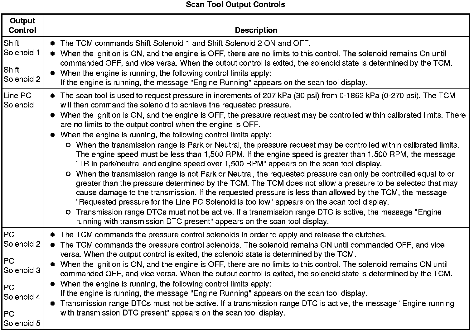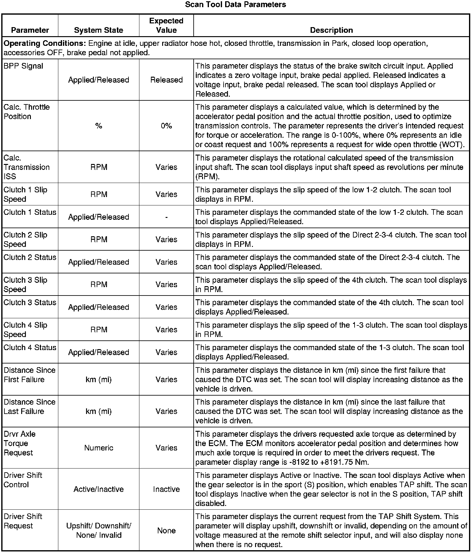 The Transmission Control Module Scan Tool Data List contains all transmission related parameters that are available on the scan tool. The list is arranged in alphabetical order. A given parameter may appear in any one of the data lists, and in some cases may appear more than once, or in more than one data list in order to group certain related parameters together.