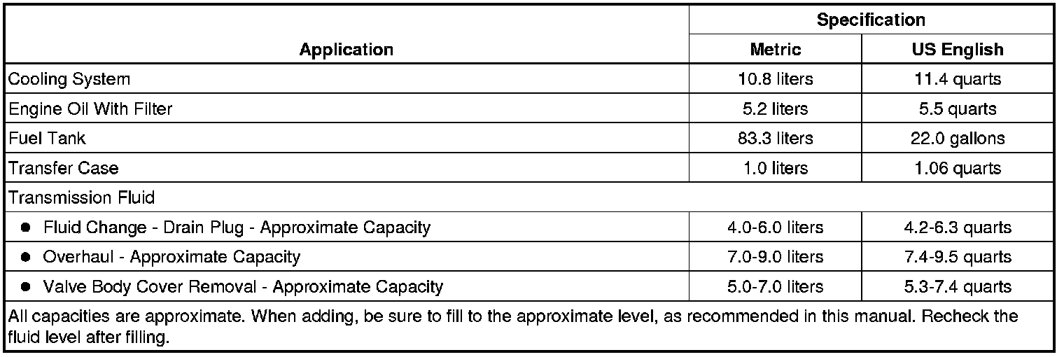 The following approximate capacities are given in US English and metric conversions. See Fluid and Lubricant Recommendations (