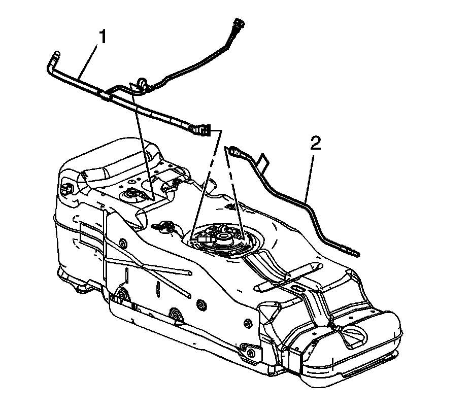 2. Disconnect the evaporative emission (EVAP) line (1) quick connect fittings from the module and the vent valve. Refer to Plastic Collar Quick Connect Fitting Service (Plastic Collar Quick Connect Fitting Service).