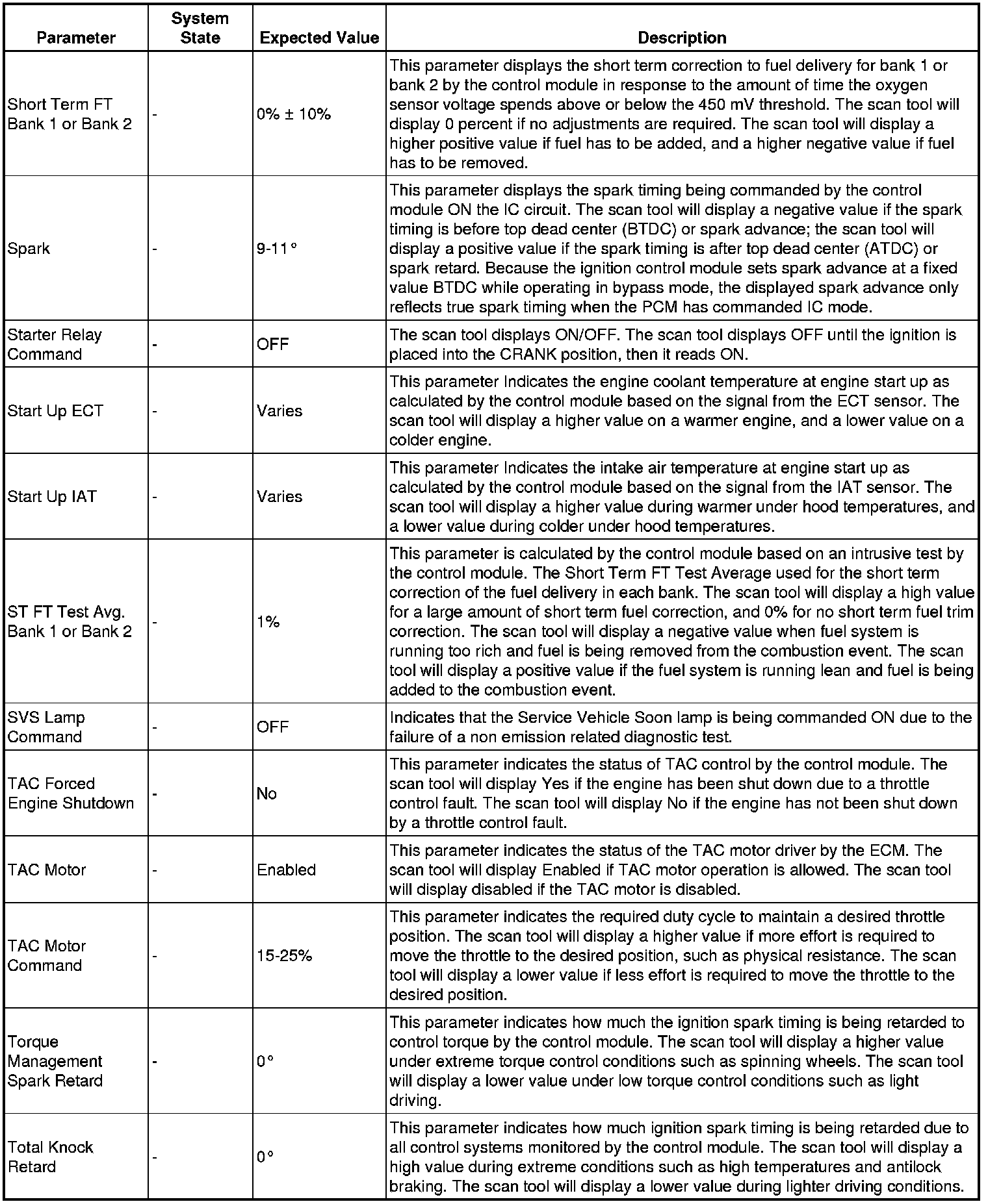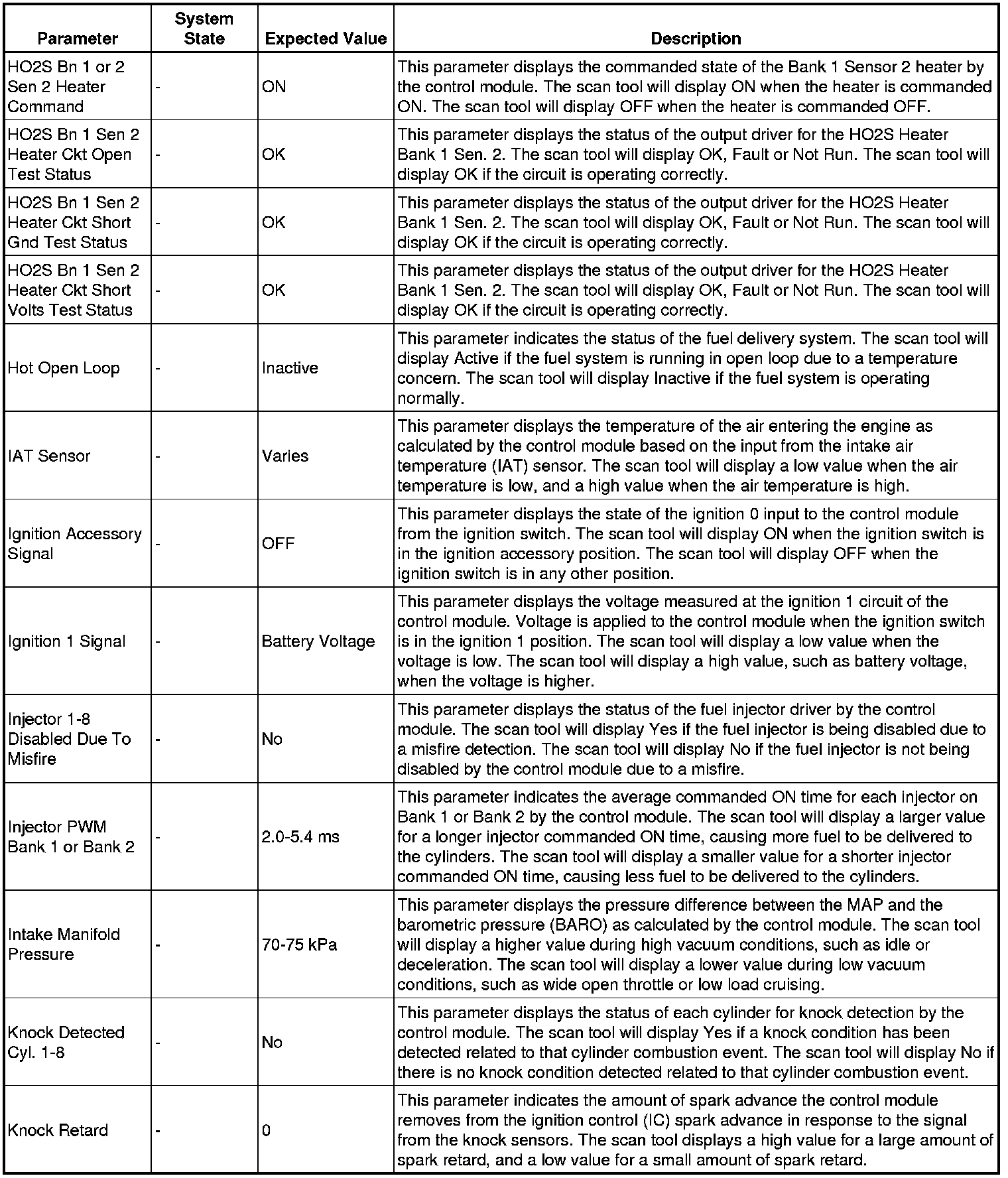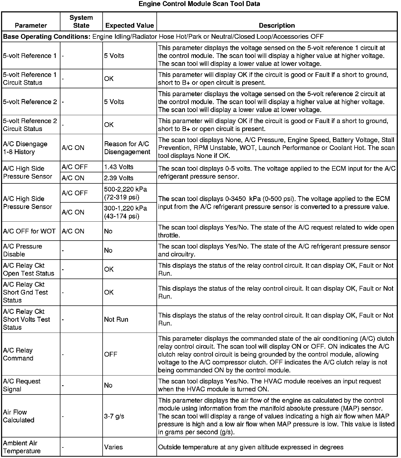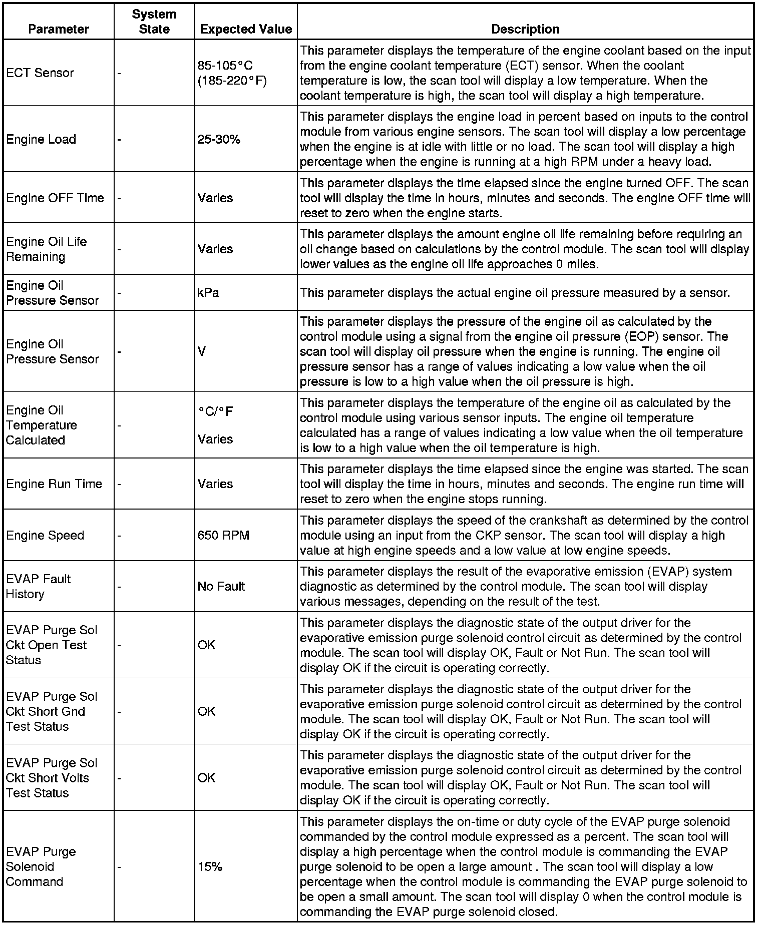 The scan tool values from a properly running engine may be used for comparison with the engine you are diagnosing. The engine scan tool data list represents values that would be seen on a normally running engine.