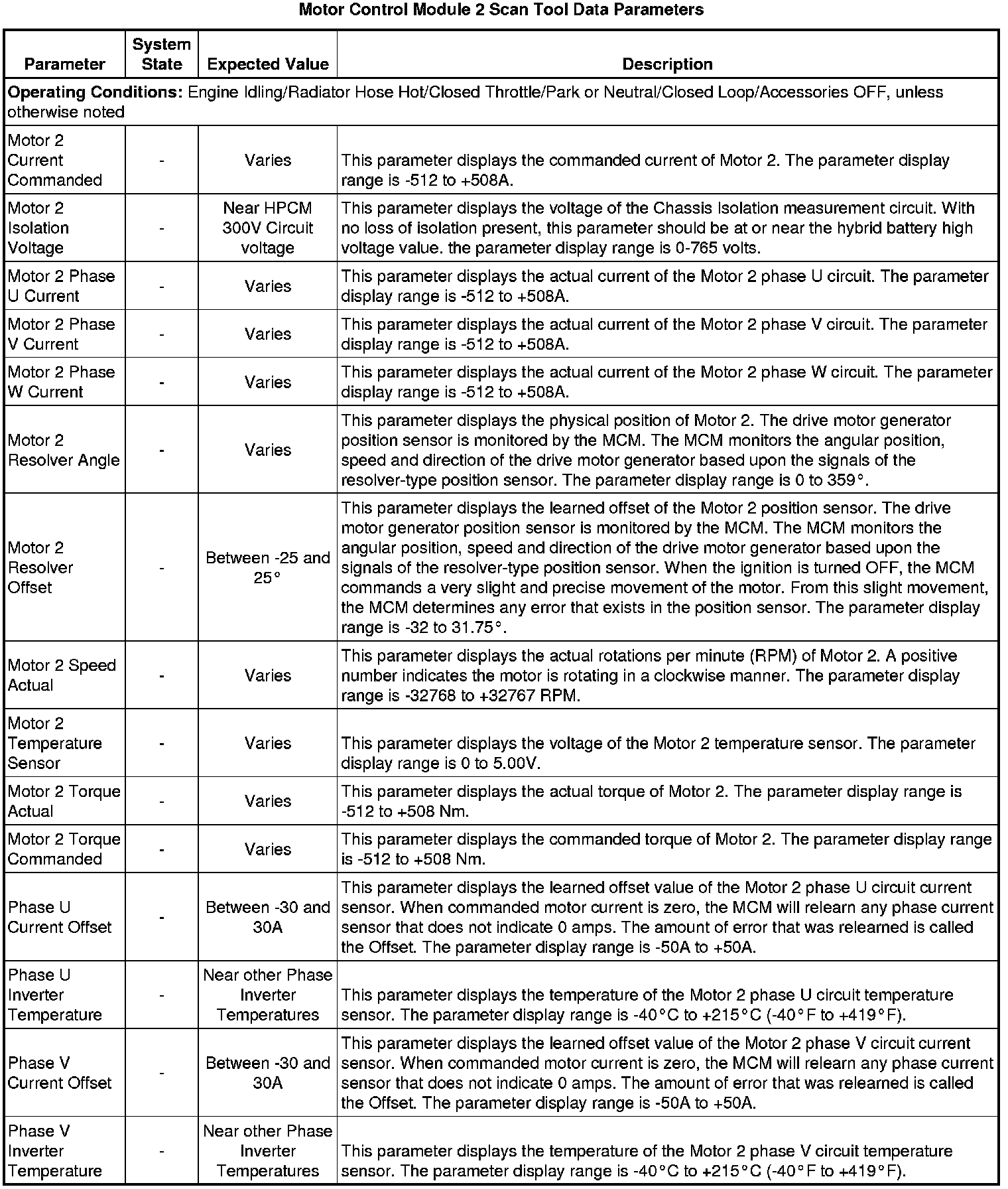 The scan tool values from a properly running vehicle may be used for comparison with the vehicle you are diagnosing. The Motor Control Module 2 Scan Tool Data Parameters list represents values that would be seen on a normally running vehicle.