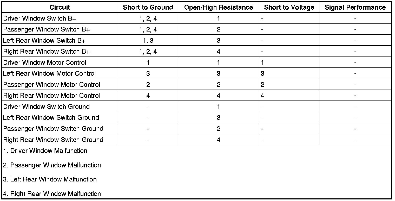 • If a window does not perform as specified, refer to Window Motor Malfunction.