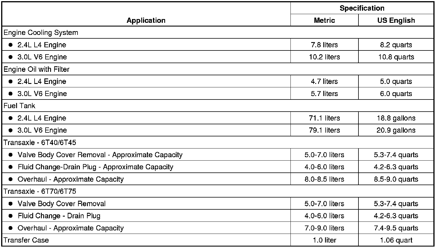 The following approximate capacities are given in US English and metric conversions. See Fluid and Lubricant Recommendations (Maintenance) for more information. All capacities are approximate. When adding, be sure to fill to the approximate level, as recommended in this manual. Recheck fluid level after filling.