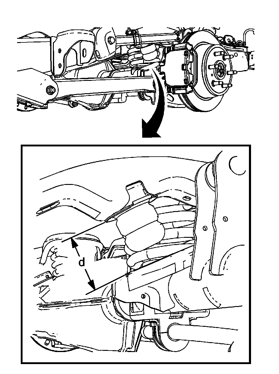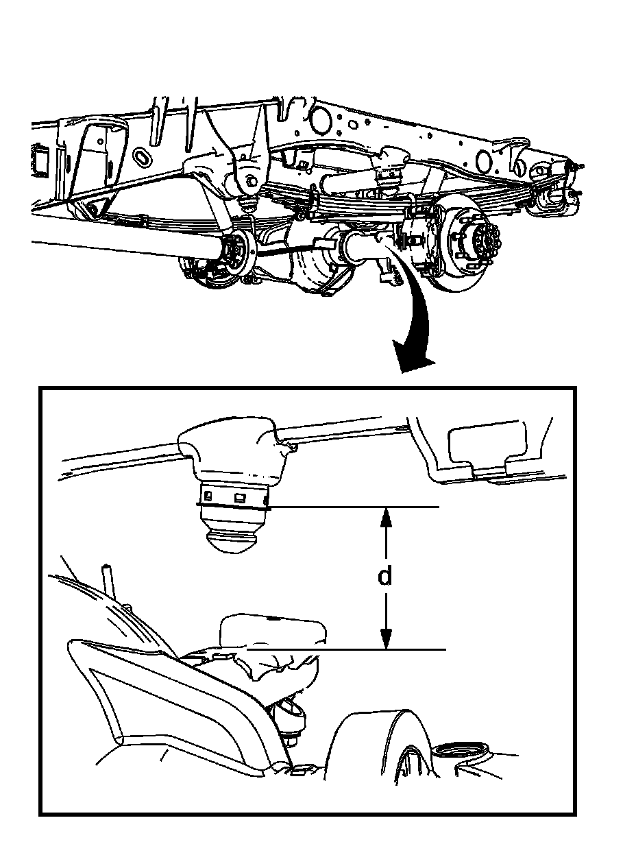 5. For the 2500/3500 Sierra/Silverado pick up trucks, measure the (D) height from the jounce bumper cup to the rear axle pad. Refer to Trim Height Specifications Trim Height Specifications.